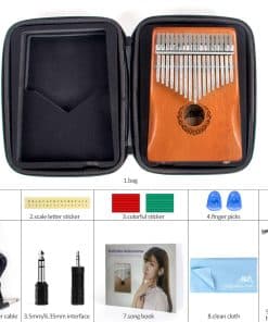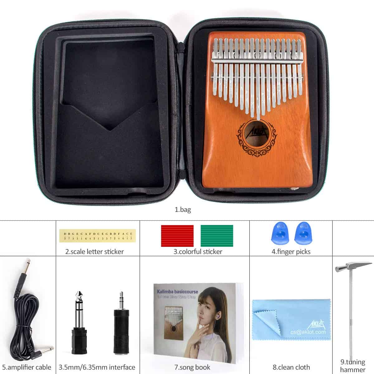 5. Lo Que Obtiene: La Kalimba de 17 teclas AKLOT viene con una bolsa protectora, libro de inicio rápido, martillo de afinación, pegatina de notas, púas y paño de limpieza.