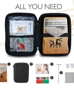 4. Accesorios Completos: piano de pulgar, martillo de afinación, manual de instrucciones, pegatina, bolsa de franela y paño de limpieza.