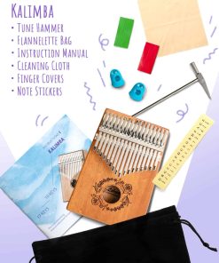 1. Contenido del Paquete – Para garantizar que cada producto cumpla con su satisfacción, los hemos probado personalmente. Incluye la kalimba, martillo de afinación, bolsa de franela, manual de instrucciones, paño de limpieza, cubiertas de dedos y pegatinas.