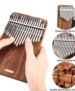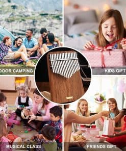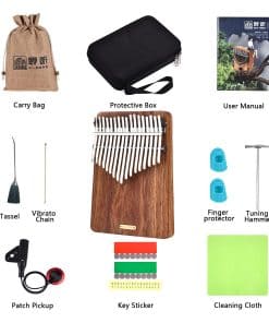 Características: Hecho de madera sólida de Palisandro de alta calidad con 17 teclas de tines de acero al carbono ajustables, proporciona un timbre brillante y claro, un sustain más largo y una sensación de tacto cómoda. ¡Este kalimba es un instrumento musical real que te asombrará! Como es fácil de tocar y se puede aprender rápidamente, simplemente sosteniéndolo en tus manos y pellizcando los tines con tus pulgares crea sonidos claros y melodiosos; también puede crear efectos de trémolo especiales con la cadena de acompañamiento. El hermoso sonido del piano de pulgar hace que la gente se sienta relajada y feliz. Especificaciones: Marca: LingTing Modelo: K17P Número de teclas: 17 Material del cuerpo: Palisandro de Palisandro Teclas: Metal de mineral Puente: Palisandro Tonalidad: B Toneladas Tamaño del artículo: 12 18 2.6cm Peso del artículo: 570g Tamaño del paquete: 24 19 9cm Peso del paquete: 1300g (Habrá un error de 1-2 mm en el tamaño) Lista de paquetes: 1 Kalimba 1 Bolsa de transporte 1 Instrucciones y libro de música 1 Nota Pegatina 1 Set de calcomanías de escala musical 1 Martillo de afinación 1 Cadena de acompañamiento 1 Decoración de borlas 1 Recogida de parches Nota: LingTing kalimba ha sido afinada antes de ser vendida, los usuarios no necesitan afinarla de nuevo y pueden usarla directamente.