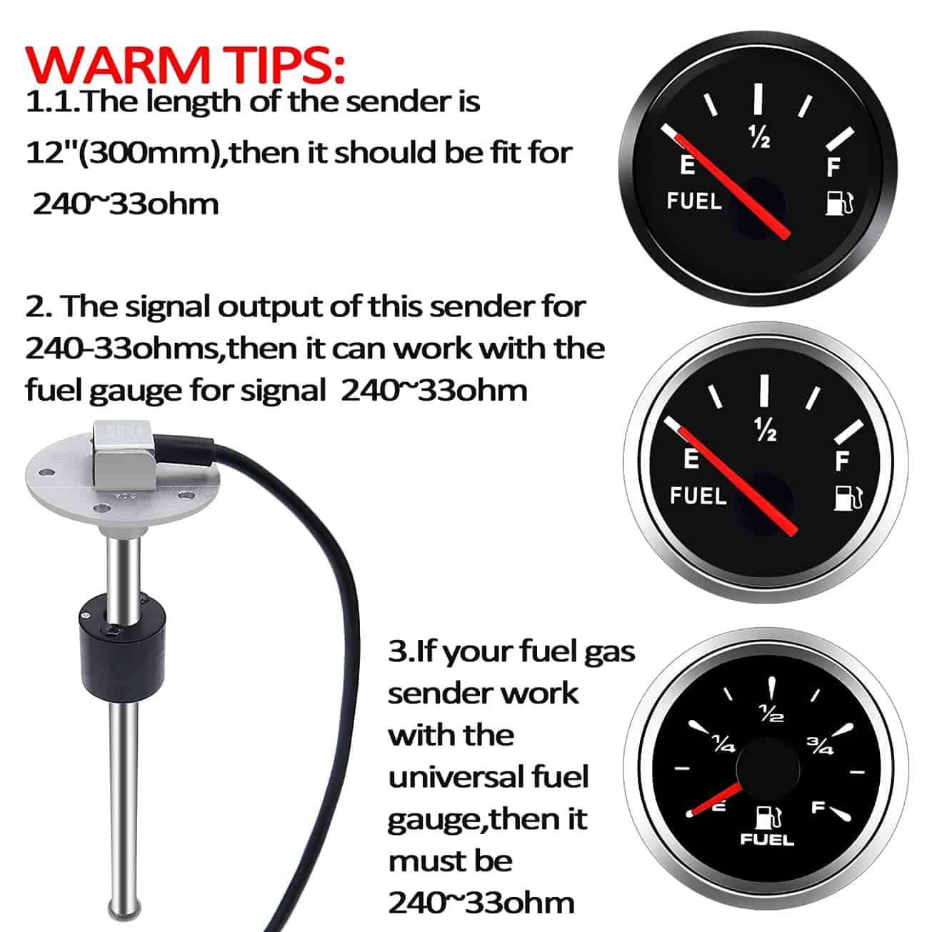 5. : El sensor de nivel de combustible para bote solo tiene un año de garantía de fábrica. Tu satisfacción es nuestra gran motivación, si tienes alguna pregunta antes o después de la compra, no dudes en contactarnos, te daremos una solución satisfactoria en 24 horas.