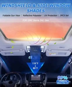 El protector solar Karltys para parabrisas y ventanas laterales de Chevy Silverado es el accesorio perfecto para mantener tu auto fresco y protegido del sol durante los días calurosos. Con un ajuste personalizado para los modelos específicos de Chevrolet Silverado y GMC Sierra, este protector solar de alta calidad está diseñado para cubrir completamente el parabrisas y las ventanas laterales delanteras, manteniendo la luz del sol, el calor y los dañinos rayos UV fuera de tu vehículo.
