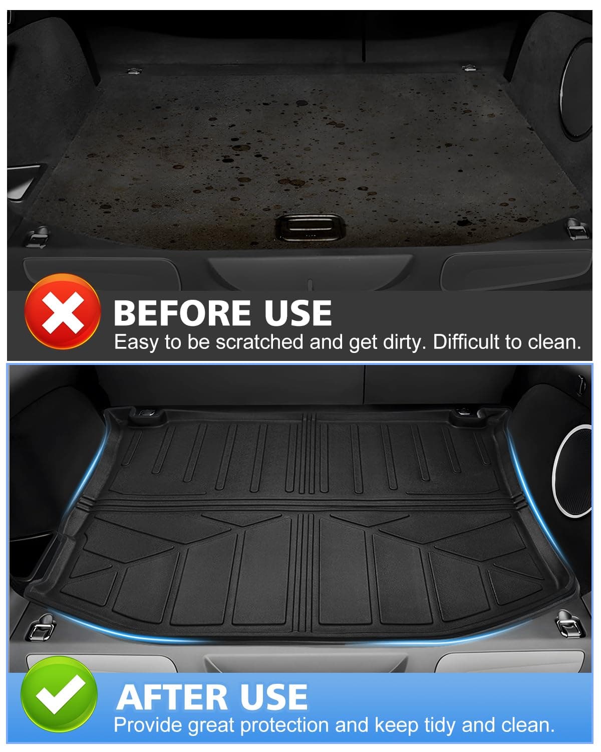 5. Fácil de instalar y limpiar Instale en segundos. Coloque el protector de carga del maletero Grand Cherokee directamente. Una solución ideal para mantener limpio el maletero interior con protección duradera. Fácil de quitar el protector de carga trasero para limpiar con agua o jabón cuando se ensucie.