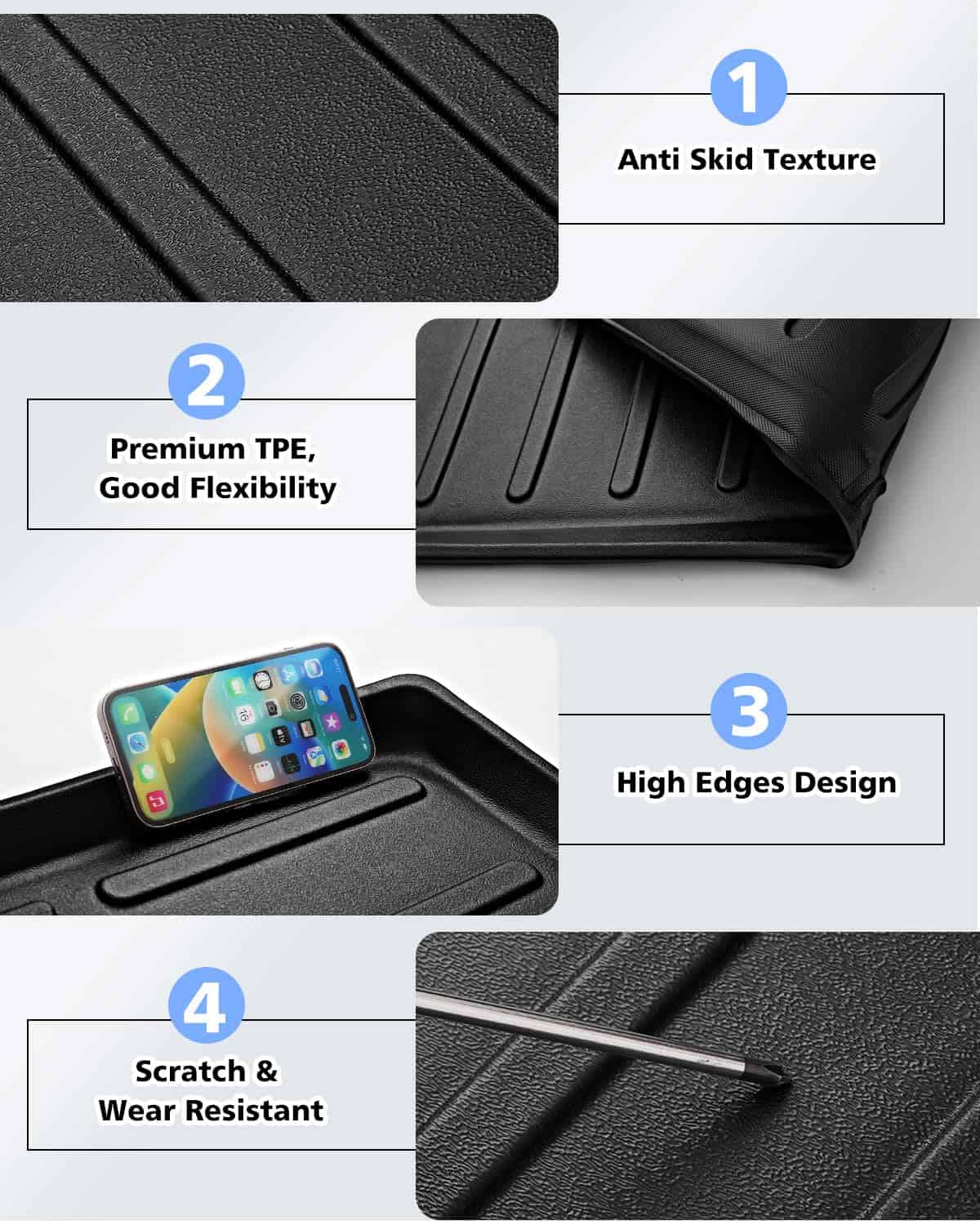 2. Material TPE grueso y resistente El protector de carga Grand Cherokee 2023 de Karltys está hecho de material TPE grueso y resistente, inodoro, seguro, flexible, fuerte y duradero. El protector de carga trasero para 2022 Jeep Grand Cherokee tiene un núcleo rígido resistente para una protección extrema y una cobertura espacial.