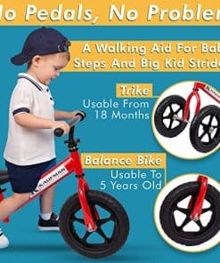 ¿Has visto una bicicleta sin pedales? Estos triciclos para bebés no los tienen. En lugar de la potencia de los pedales, los niños usarán sus pies para moverse hacia adelante (piensa en el pie móvil de Fred Flintstone). De esta manera, los niños pueden concentrarse más en ganar equilibrio. Esto también es útil para enseñar a los niños a caminar. Al mover sus pies con la bicicleta, los niños ejercitan los grupos musculares necesarios para ayudarles a caminar de manera estable.