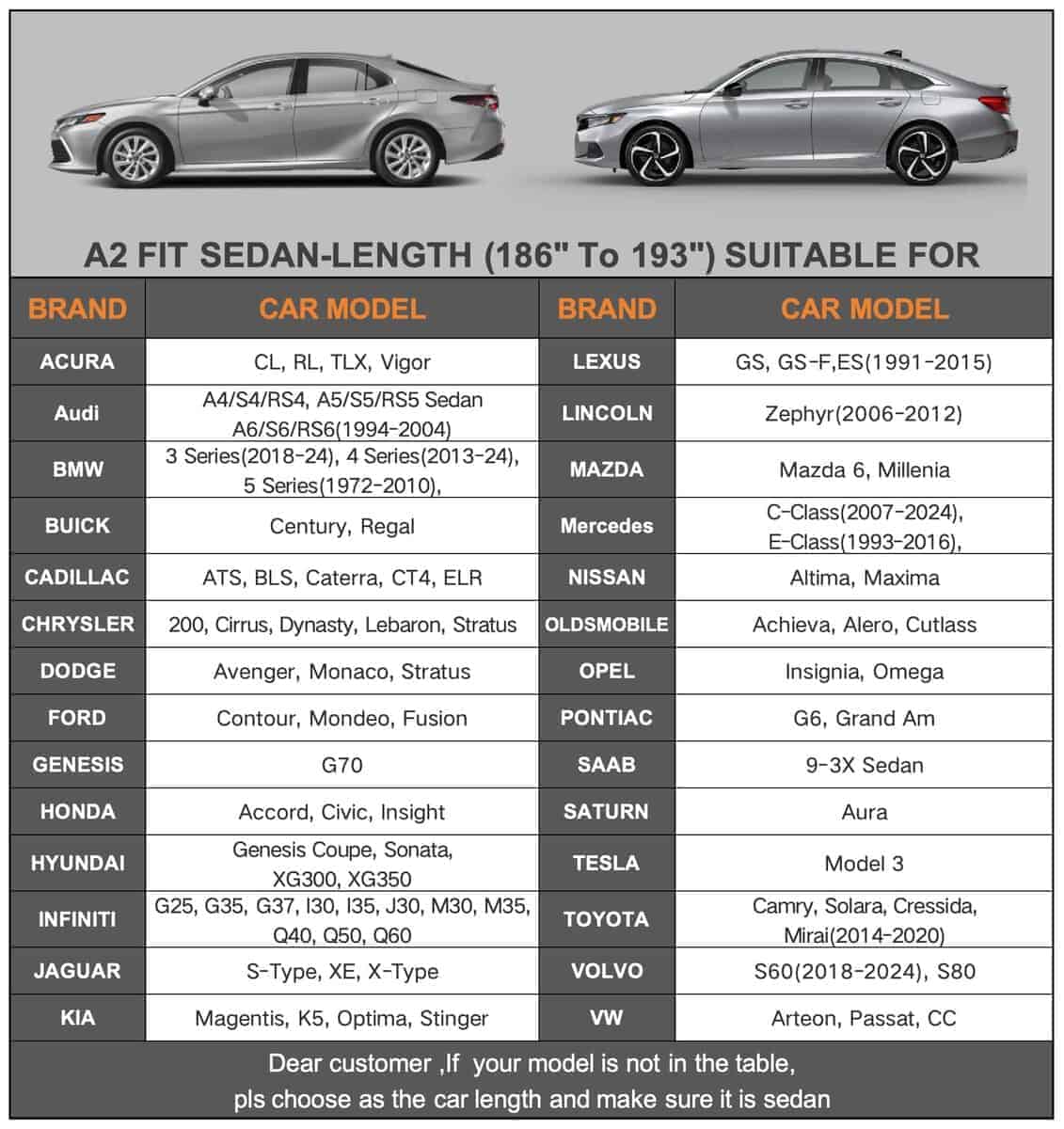3. Dimensión A2 -3XL Ajuste universal para sedán con una longitud de 186 a 193 pulgadas. (NO APTO PARA HATCHBACK Y SUV). Adecuado para Toyota Camry, Honda Accord/Civic, Nissan Altima/Maxima, Cadillac CT4/ATS, Kia K5/Optima/Stinger, Hyundai Sonata, Tesla modelo 3, Ford Fusion, Audi A4/A5, Serie BMW 3/4, Mercedes-Benz Clase C, etc.