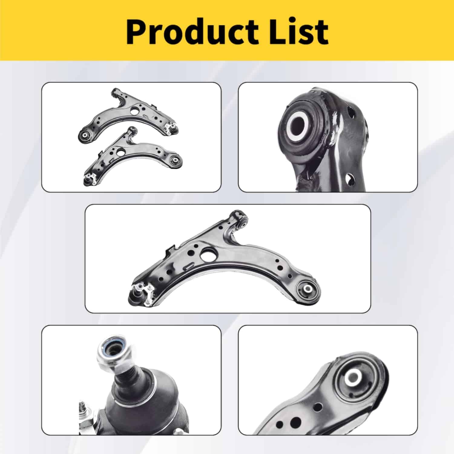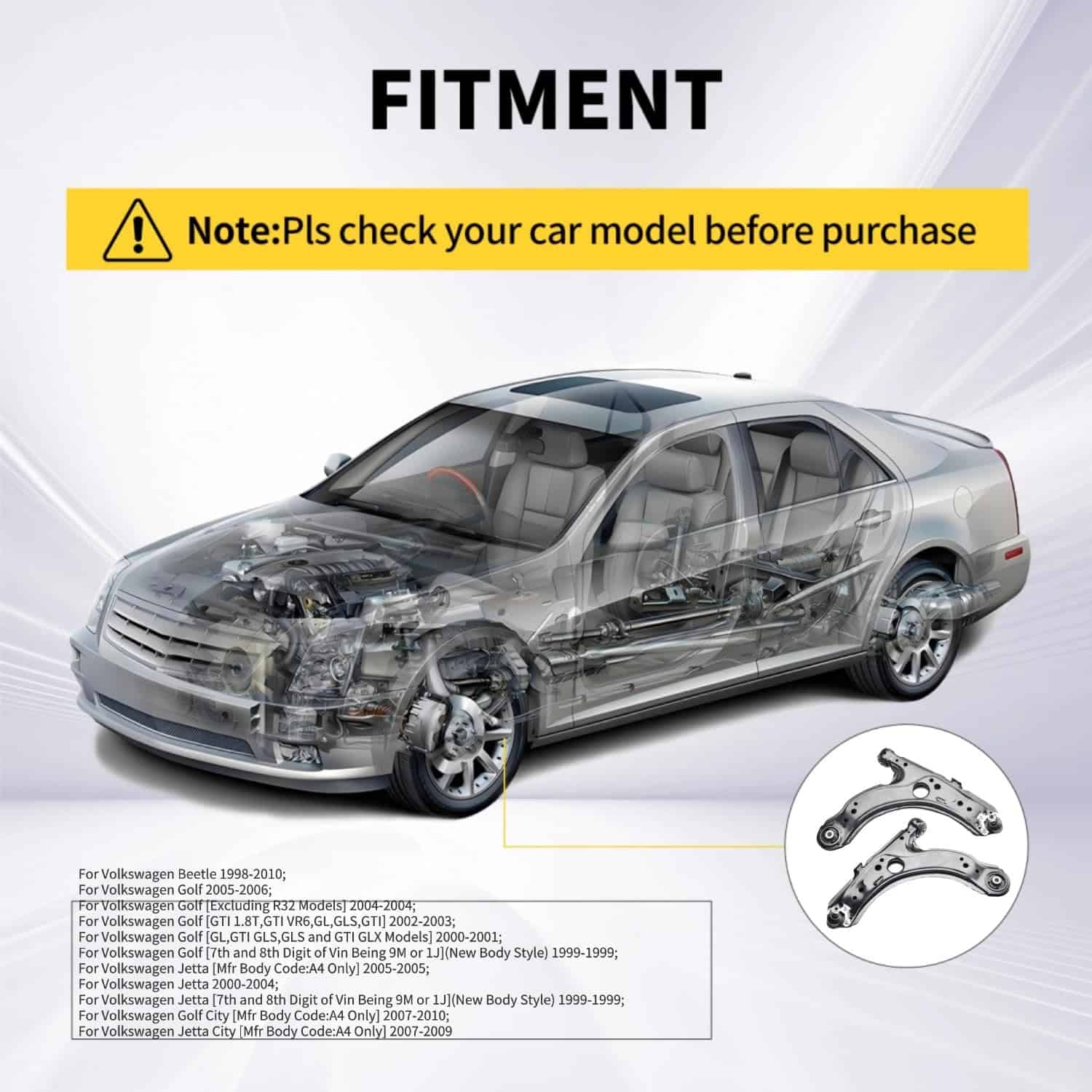 1. Para Volkswagen Beetle 1998-2010; Para Volkswagen Golf 2005-2006; Para Volkswagen Golf Excluyendo modelos R32 2004-2004; Para Volkswagen Golf GTI 1.8T, GTI VR6, GL, GLS, GTI 2002-2003. 2. Para Volkswagen Golf GL, GTI GLS, GLS y modelos GTI GLX 2000-2001; Para Volkswagen Golf 7mo y 8vo dígito de VIN siendo 9M o 1J (Nuevo estilo de carrocería) 1999-1999; Para Volkswagen Jetta Código de carrocería Mfr: A4 Solo 2005-2005. 3. Para Volkswagen Jetta 2000-2004; Para Volkswagen Jetta 7mo y 8vo dígito de VIN siendo 9M o 1J (Nuevo estilo de carrocería) 1999-1999; Para Volkswagen Golf City Código de carrocería Mfr: A4 Solo 2007-2010; Para Volkswagen Jetta City Código de carrocería Mfr: A4 Solo 2007-2009. 4. Número de referencia: CK620717 RK620717 2605459, CK620718 RK620718 2605460, CMS701121 CMS701122 45D3248 45D3247, K620717 K620718 524-144 524-143. 5. El paquete incluye: 2Pcs K620717 Brazos de control inferiores delanteros Izquierdo y Derecho – K620717 K620718