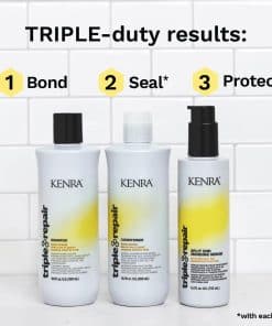 Los productos de reparación triple de Kenra están formulados científicamente para ofrecer 3 beneficios. Las fórmulas objetivan y reparan el daño donde sea necesario además de prevenir más daño capilar cuando se usan como un sistema. 1. Objetiva y repara enlaces débiles o rotos dentro del cabello. Reduce la rotura en más del 89% frente a la rotura al peinar en cabello dañado vs. un champú sin acondicionador. 2. Sella cutículas externas, reparando visualmente hasta un 90% de las puntas abiertas con cada uso. 3. Fórmula con péptidos y aminoácidos que ayudan a fortalecer y proteger los mechones contra el daño diario y factores estresores ambientales. ¡Revela un cabello de aspecto saludable, resistente a la rotura y la decoloración en un solo uso! vs. un champú sin acondicionador.