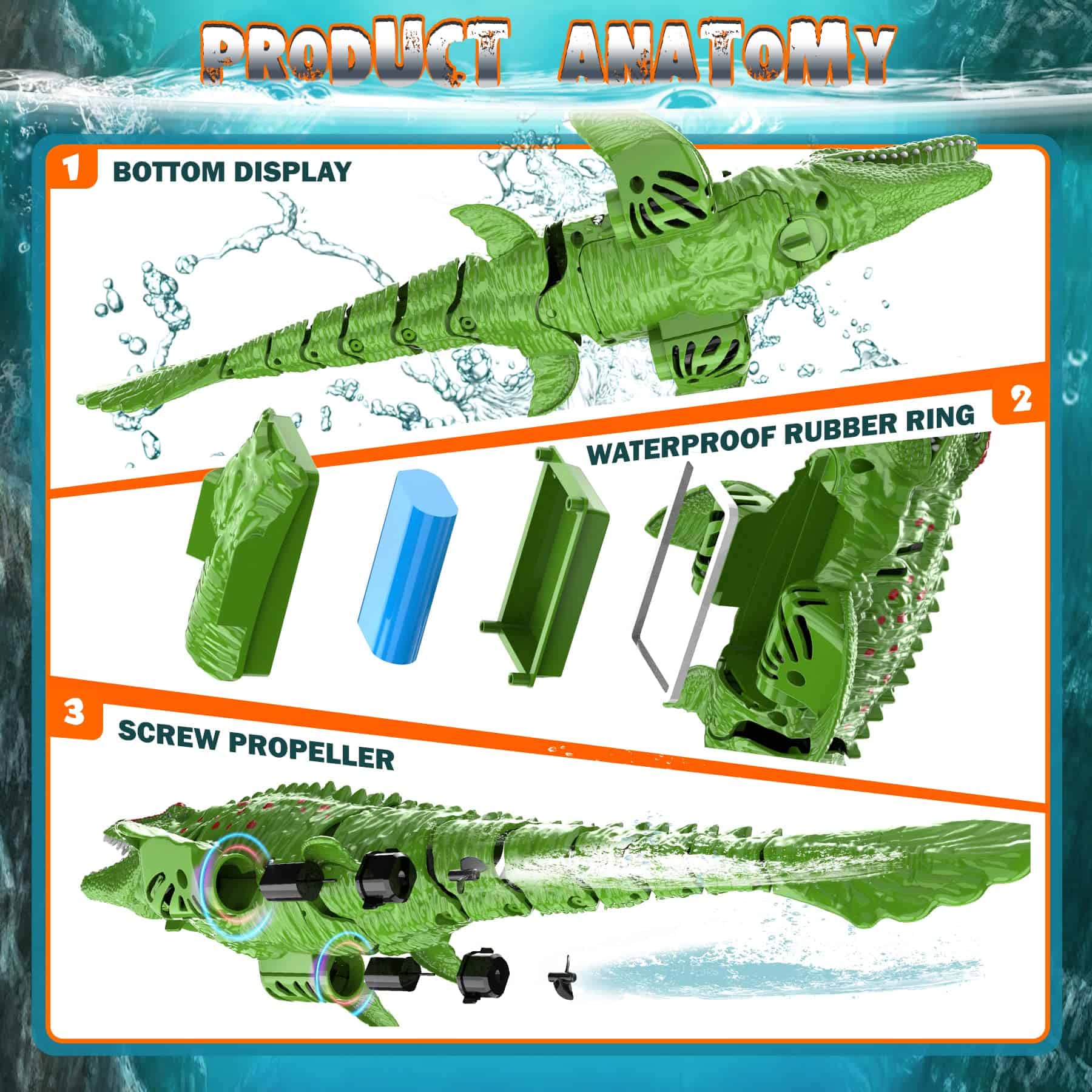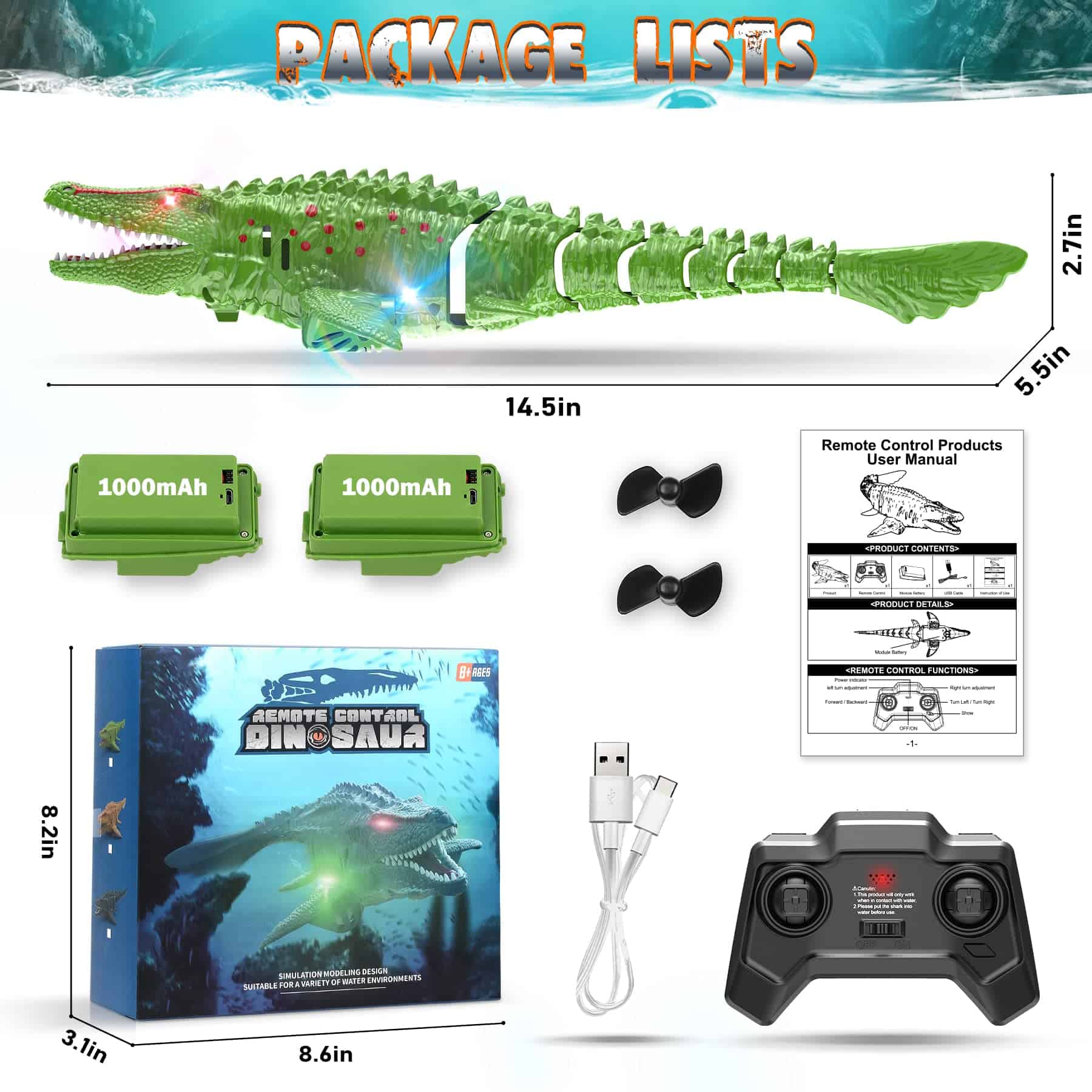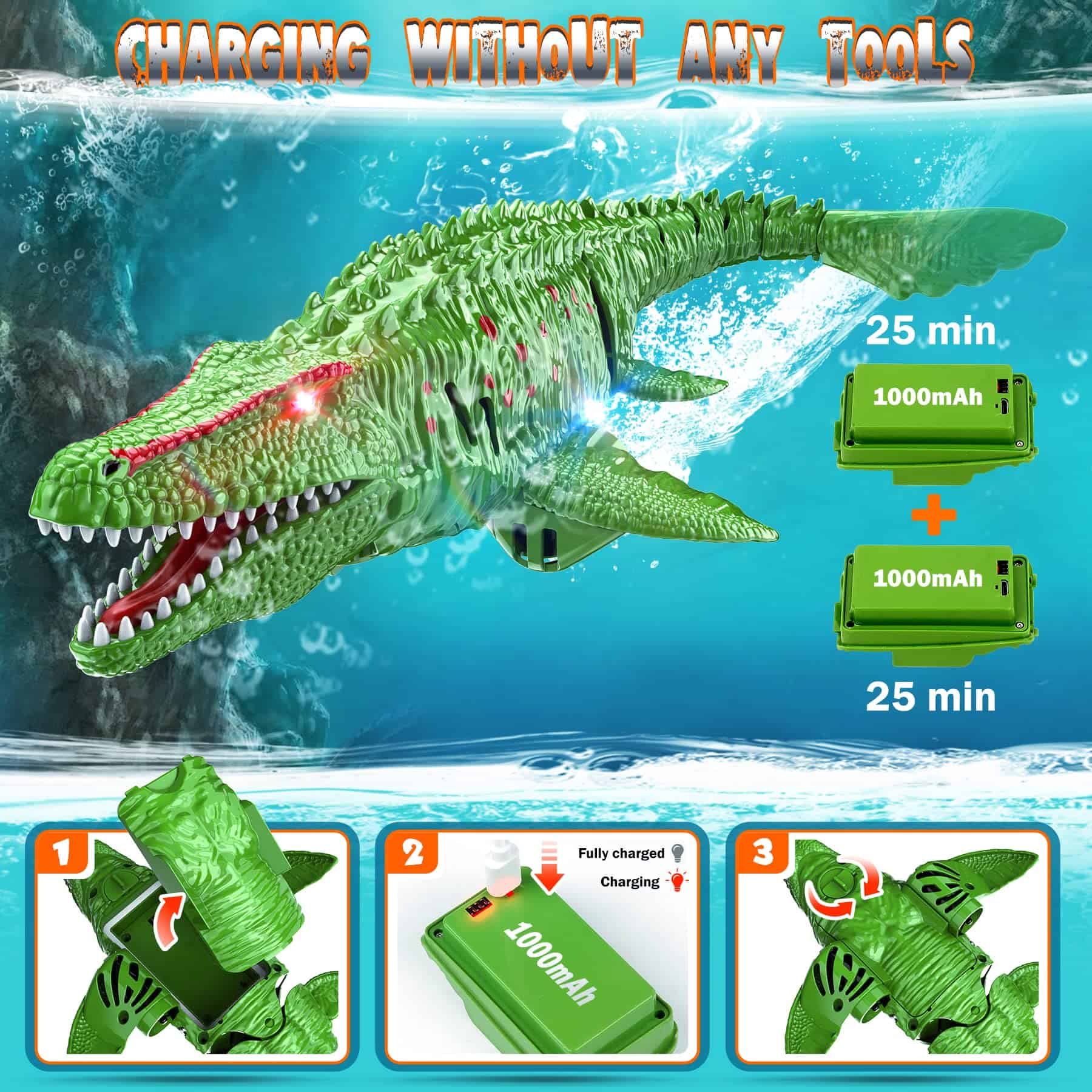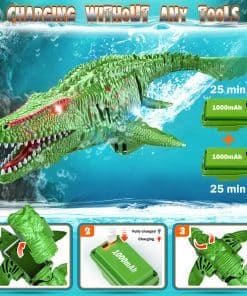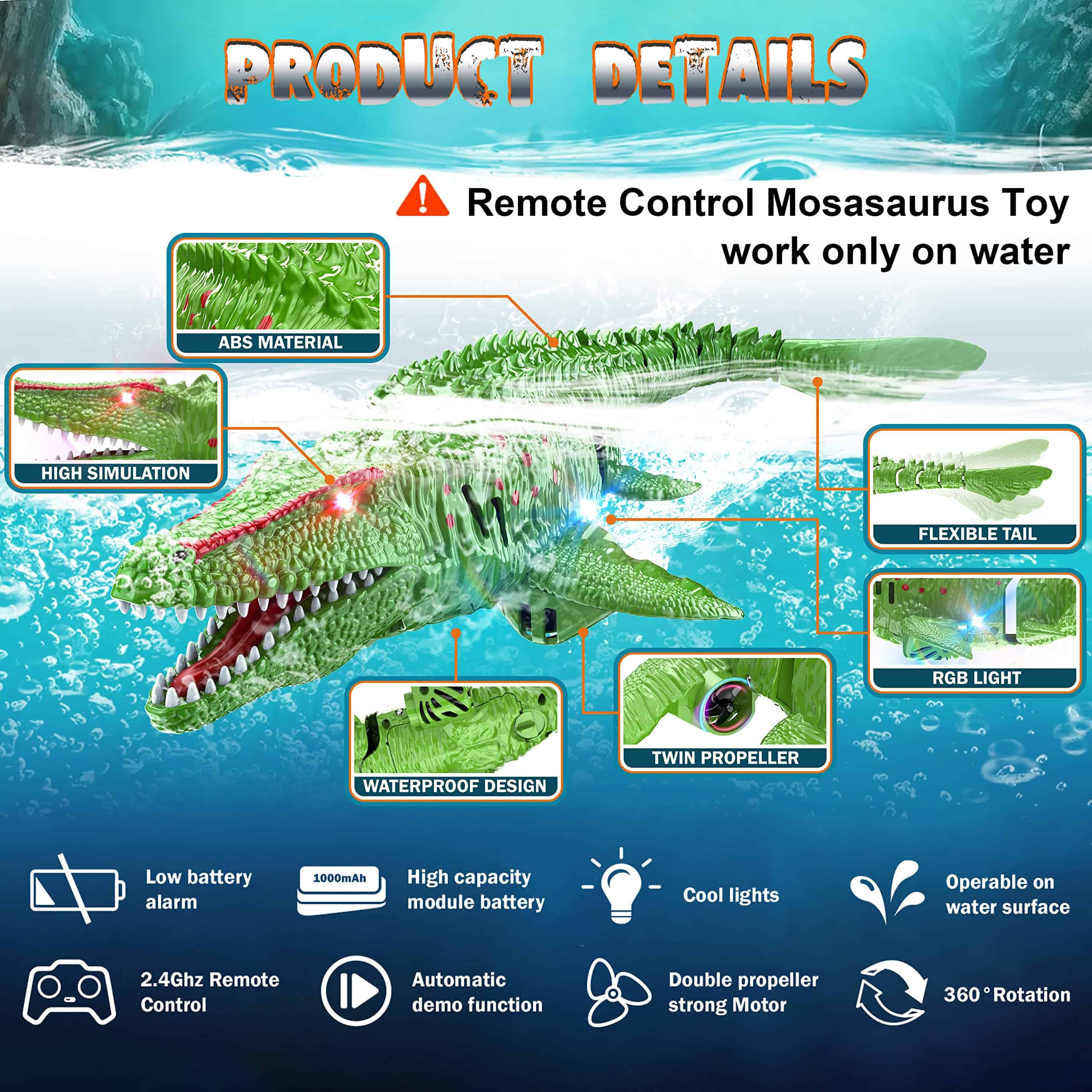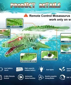 Doble motores y seguridad No solo tiene una forma aerodinámica con una articulación de cola mecánica flexible, sino que también tiene hélices dobles equipadas con motores para garantizar que el mosaurio tenga suficiente potencia para moverse libremente; y el mosasauro RC solo se encenderá y funcionará cuando se coloque en el agua, el mosaurio se apagará cuando salga de la superficie del agua. Las hélices de ambos lados dejan de funcionar, lo que también proporciona protección de seguridad para los niños.