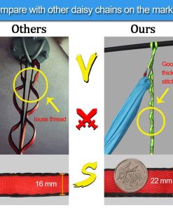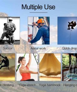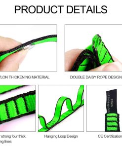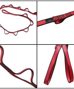 La cadena de margaritas ajustable no solo es para escalada, sino también para acampar (puedes sujetar mosquetones a los bucles y luego colgar tus herramientas al aire libre con los bucles. En viajes de camping, puedes colgar hamacas y/o columpios con él) Con el bucle especializado, la cadena de margaritas se puede acortar a cualquier bucle de forma segura. Puede ser ampliamente utilizado en yoga, Pilates, escalada, rescate, etc., las correas son una herramienta de entrenamiento portátil perfecta que puede llevar consigo en cualquier momento y lugar. También sirven como excelentes correas extendidas para el trapecio de yoga.