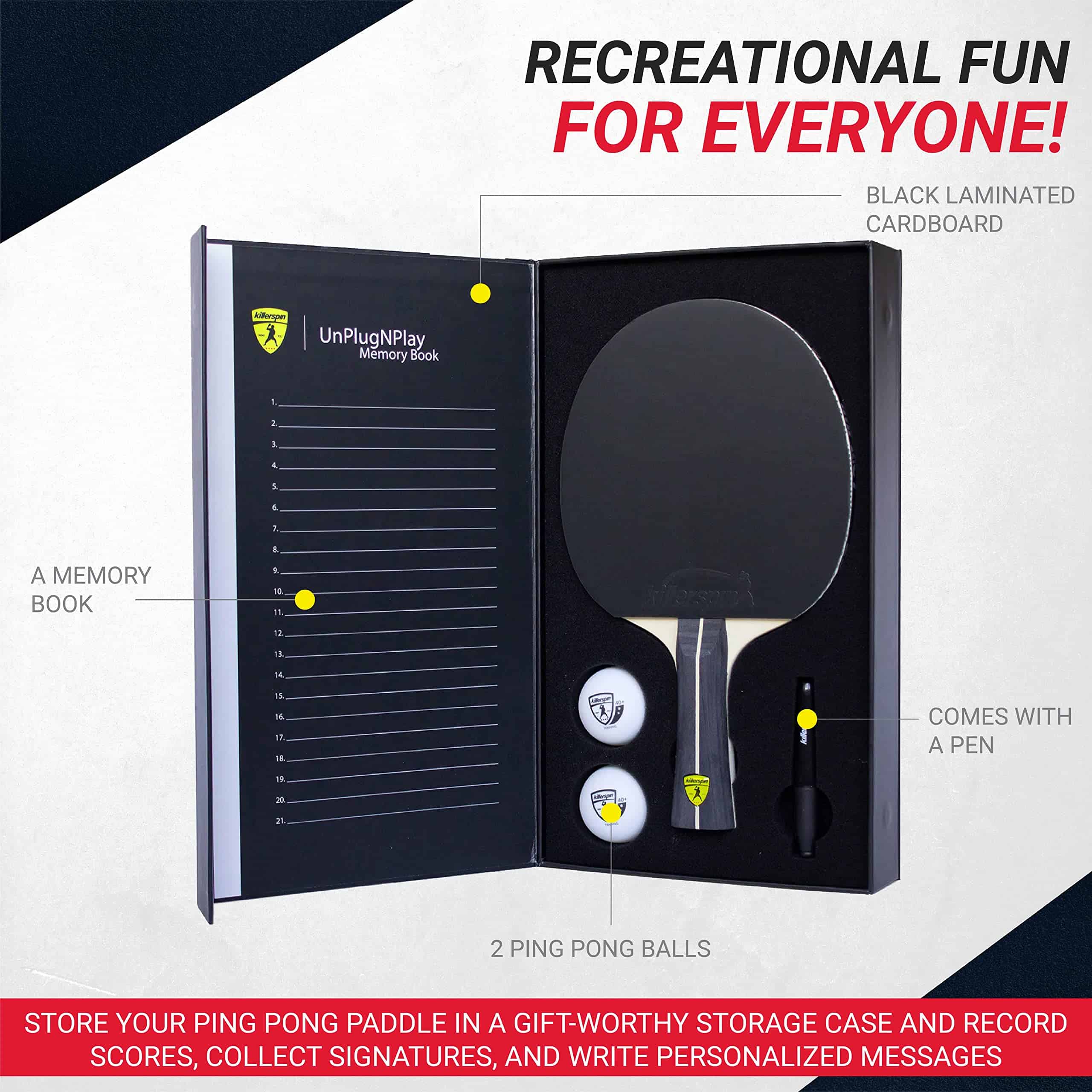 La raqueta IMPACT D2 es perfecta para un estilo de juego todo terreno; para aquellos jugadores que buscan aprender golpes básicos, el buen control y la sensación de la pelota para los que esta raqueta está ajustada. Estas raquetas de ping pong Killerspin están diseñadas para simplificar el agarre, asegurando que el jugador obtenga una buena sensación y control de la raqueta, así como sentir cómo la pelota giraría, lobearía y se aceleraría según varios tiros. Con madera de 5 capas, estas raquetas profesionales de ping pong tienen una capa de goma duradera que garantiza una excelente calidad y sensación al jugar. La muesca en el centro del mango está diseñada específicamente para simplificar el agarre. Sus especificaciones incluyen – Control: 8.5 / Giro medio: 7.0 / Velocidad media. Esta raqueta de ping pong viene con mangos cónicos. La forma única del mango minimiza el deslizamiento de los dedos y mejora el contacto del agarre con la palma de la mano, especialmente para jugadores novatos. Estas palas de tenis de mesa vienen empaquetadas en un libro de memorias de cartón laminado mate negro con un cierre magnético. La funda también brinda la protección necesaria para su raqueta de ping pong, junto con un bolígrafo y una sección para tomar notas! Sus especificaciones incluyen – Control: 8.5 / Giro medio: 7.0 / Velocidad media. Esta raqueta de ping pong viene con mangos cónicos. La forma única del mango minimiza el deslizamiento de los dedos y mejora el contacto del agarre con la palma de la mano, especialmente para jugadores novatos. Estas palas de tenis de mesa vienen empaquetadas en un libro de memorias de cartón laminado mate negro con un cierre magnético. La funda también brinda la protección necesaria para su raqueta de ping pong, junto con un bolígrafo y una sección para tomar notas!