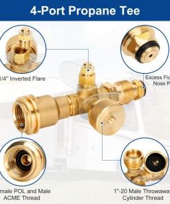 2. Kit de 4 Puertos de Propano en Latón: la T de propano de 4 puertos se monta entre la fuente de alimentación y el regulador en una autocaravana o vehículo recreativo. Conexiones hembra x roscas de nariz suave de flujo super x roscas cilíndricas desechables macho de 1″-20 x chamfer hembra de 1/4″. Hechos de latón sólido al 100%, todos los conectores en nuestros kits garantizan durabilidad y rendimiento fiable. La T de Propano de 4 Puertos cuenta con protección contra derrames. Además, hace que su tanque de propano a bordo sea más versátil y conveniente para múltiples usos.