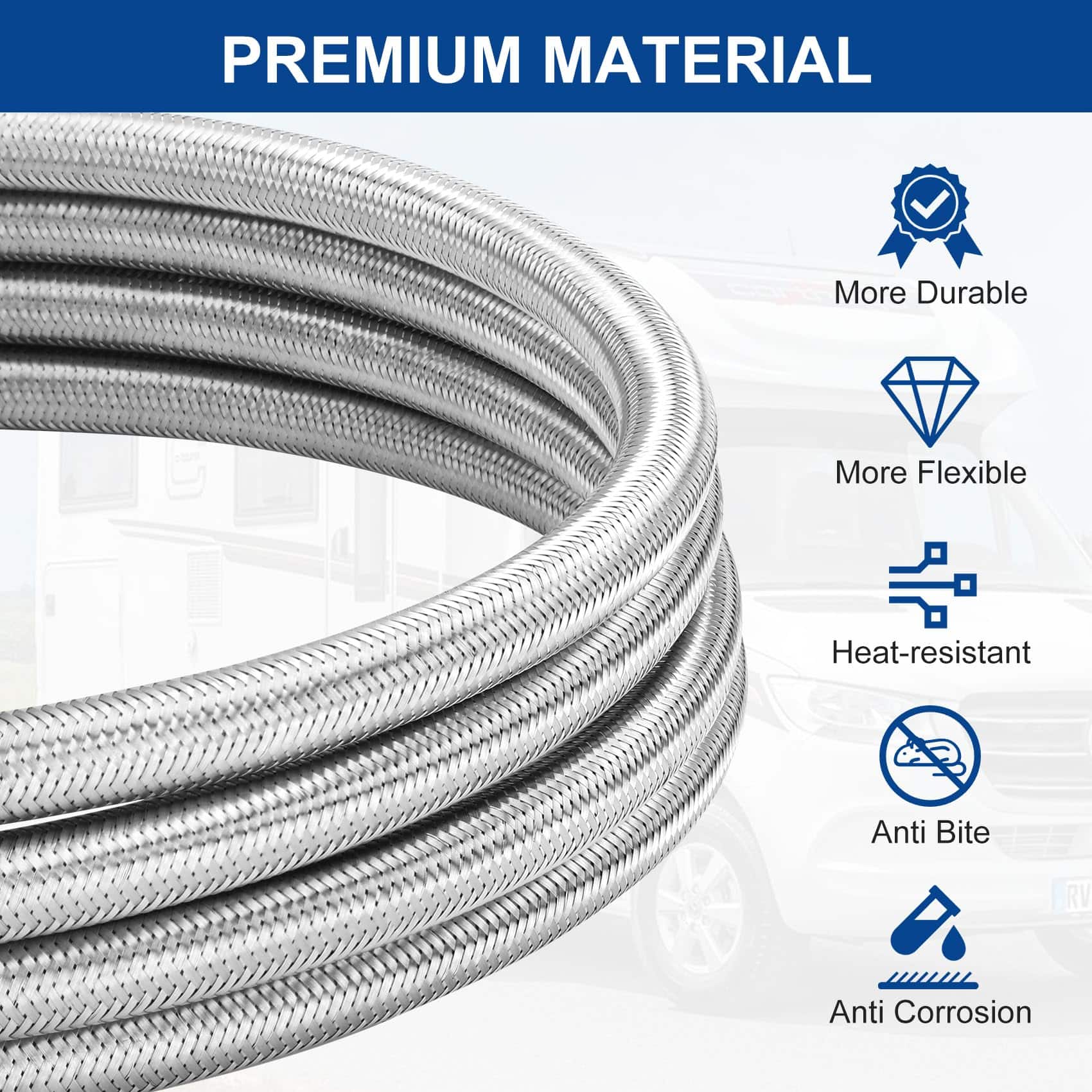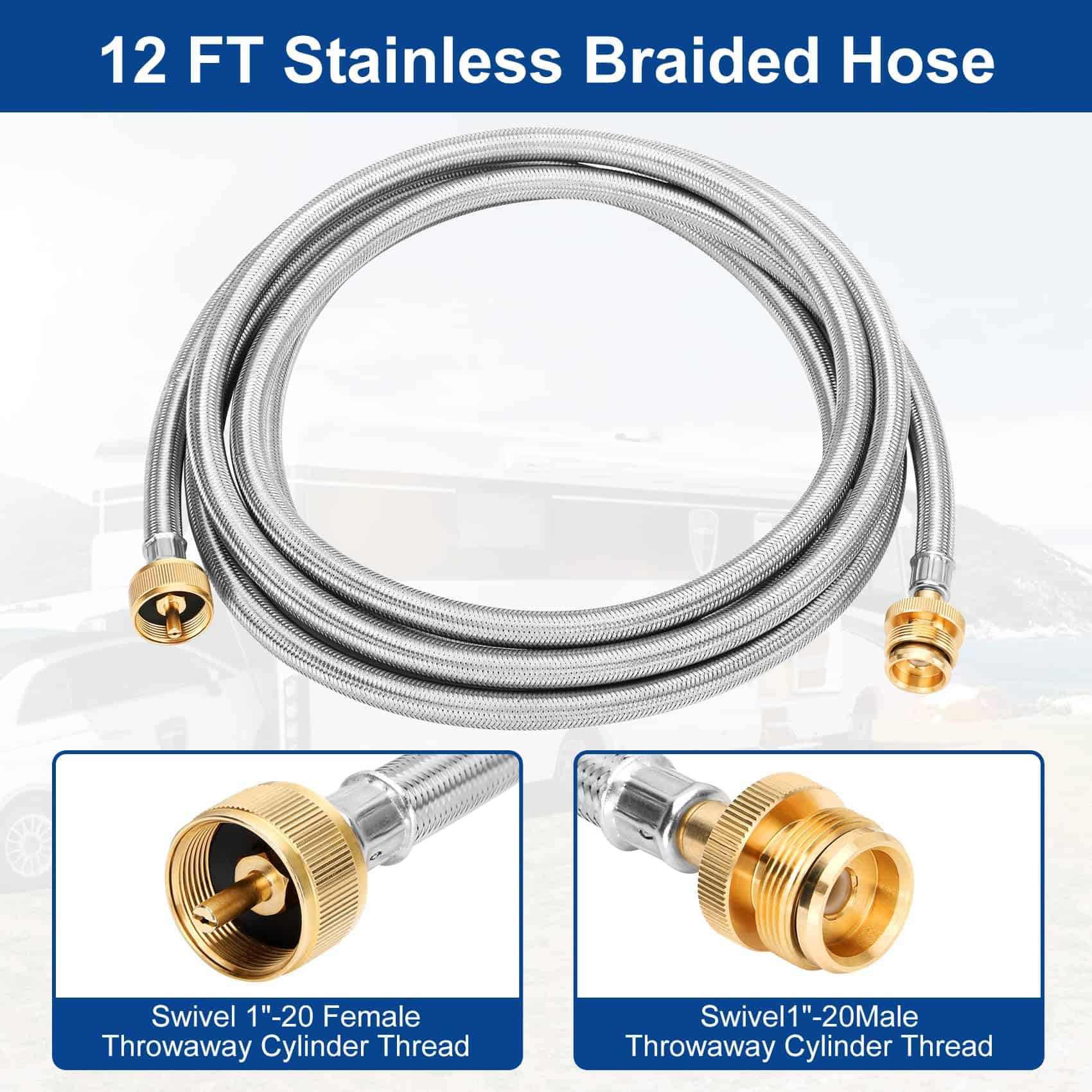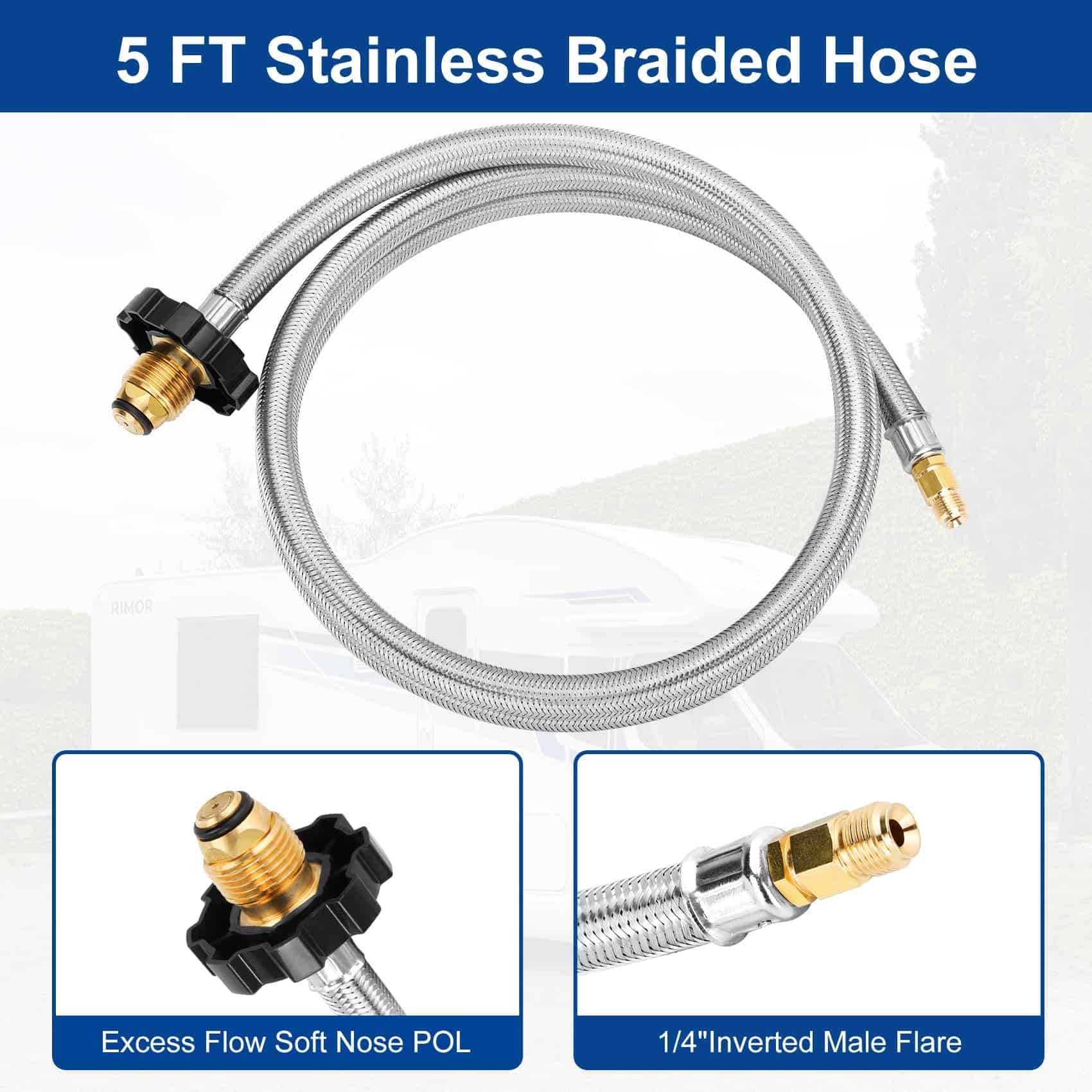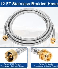 3. Manguera de 5 pies y 12 pies Trenzada de Acero Inoxidable: Nuestra manguera de propano está hecha de 4 capas de trenza de acero inoxidable, resistencia a la corrosión, resistencia al envejecimiento, estanqueidad al aire, resistencia al calor, flexibilidad y otras características. Manguera de tanque auxiliar trenzada de acero inoxidable de 5 pies actualizada: nariz suave macho POL x macho invertido de 1/4″. Manguera de 5 pies para conectar un tanque de propano adicional. Manguera de electrodomésticos trenzada de acero inoxidable de 12 pies actualizada: para un electrodoméstico adicional para varias aplicaciones de baja presión.