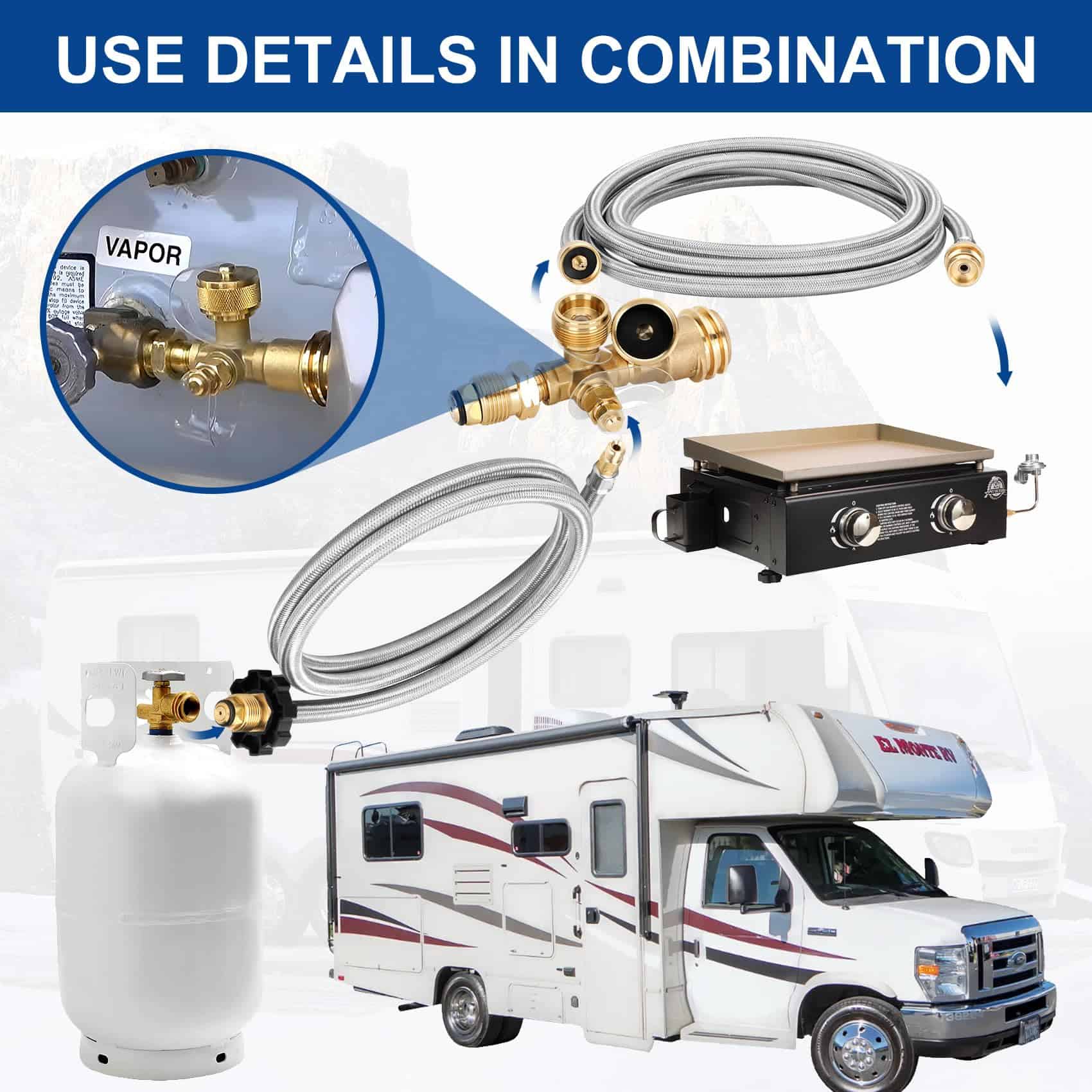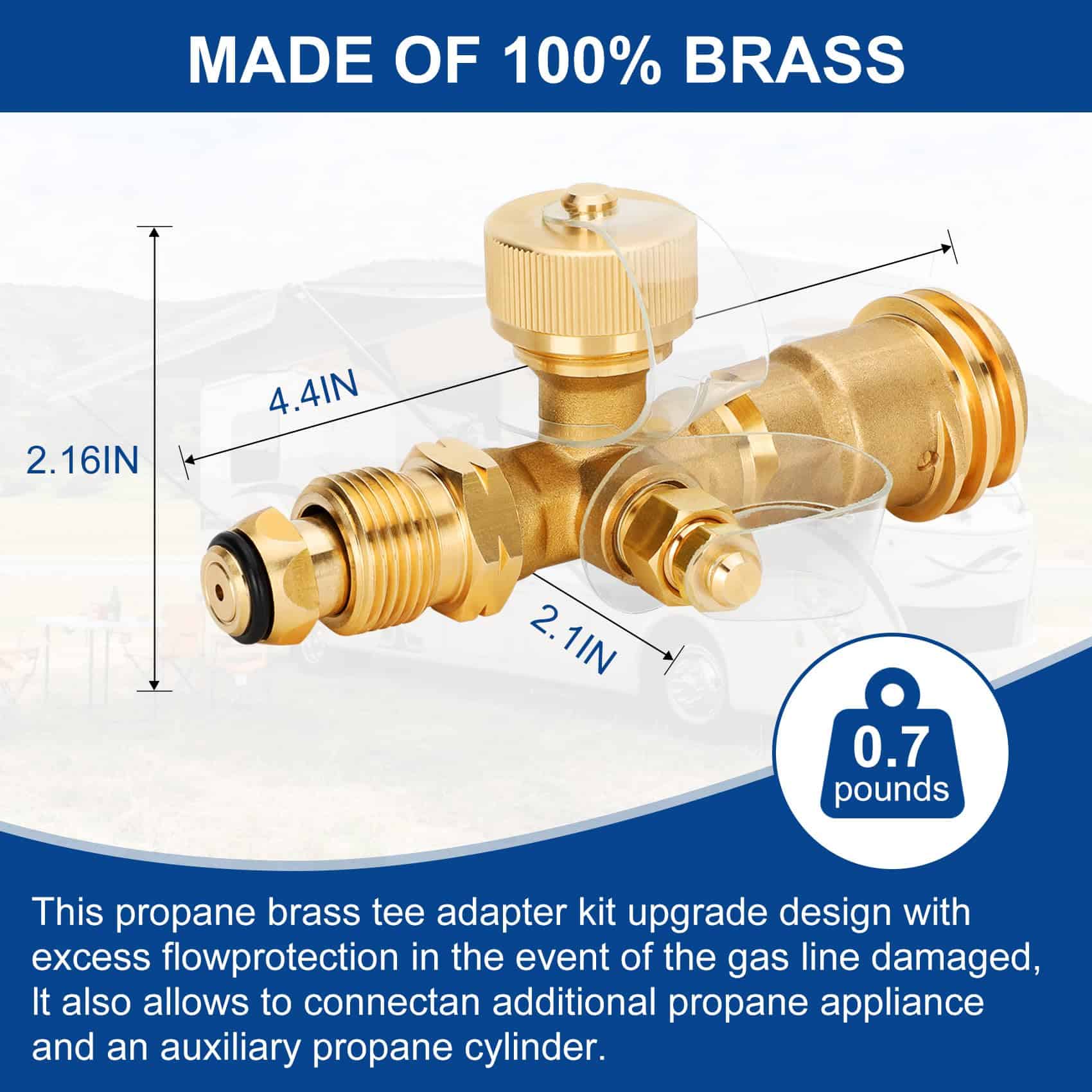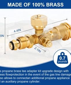 4. Eleve Su Experiencia en RV y Proteja su Seguridad: Eleve su estilo de vida en RV con nuestro Kit de Adaptador de T de Propano en Latón, especialmente diseñado para estancias prolongadas y diversas necesidades alimentadas por propano. Mientras tanto, la seguridad es una prioridad y nuestro Kit de Adaptador de T de Propano en Latón garantiza una conexión a prueba de fugas y segura. Las conexiones y válvulas incluidas están diseñadas. NOTA: Por favor, use una llave para apretar la conexión al instalar, de lo contrario, puede producirse fugas de gas durante el uso.