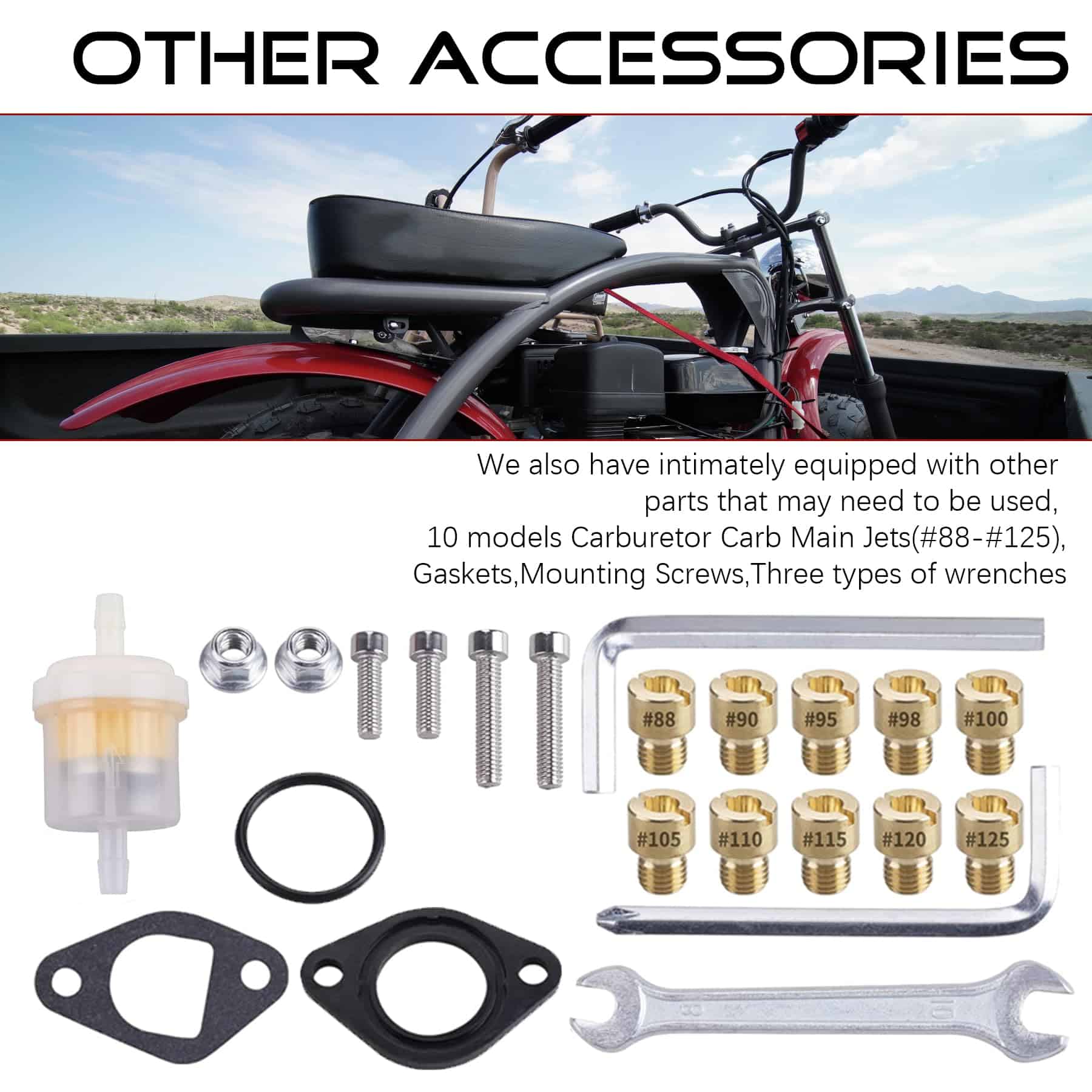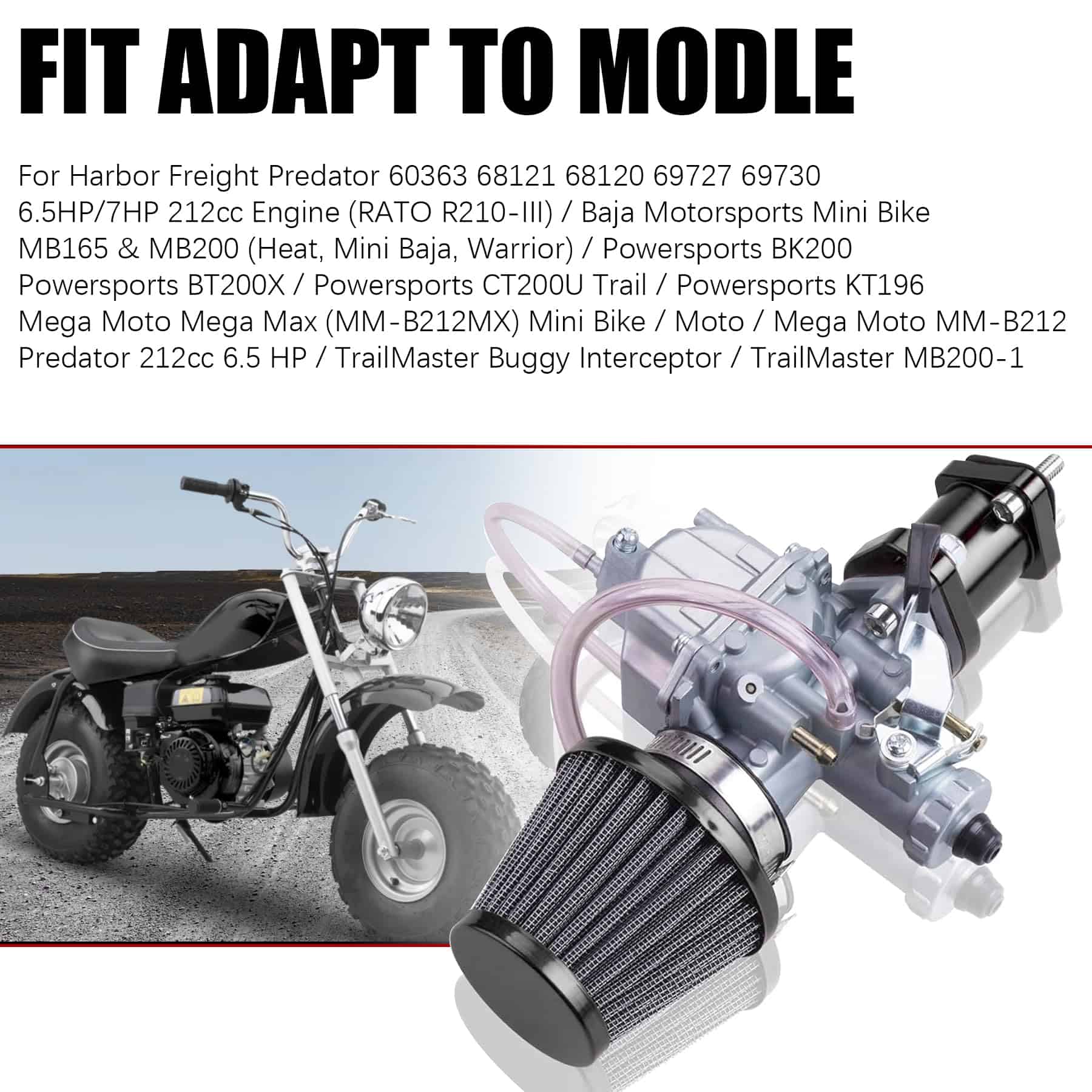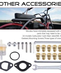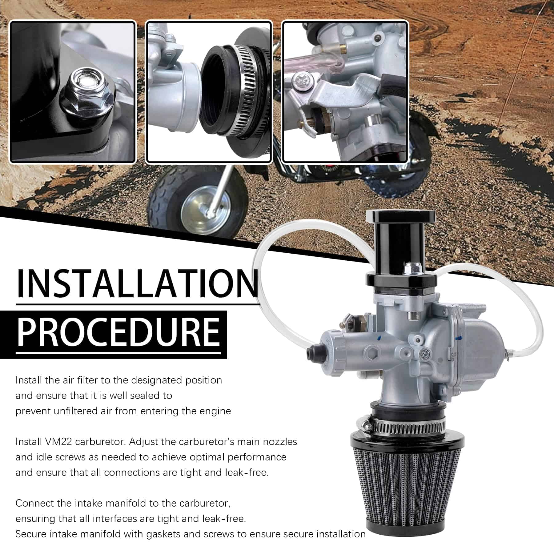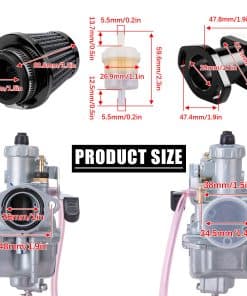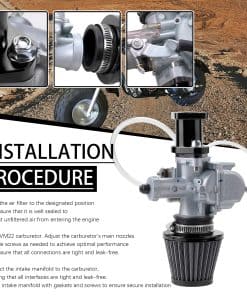 El kit de carburador VM22 está diseñado para entusiastas que buscan aumentar la potencia y eficiencia en sus motos de tierra. El carburador y el filtro de aire más grandes aseguran que el motor reciba un suministro adecuado de aire, lo cual es fundamental para maximizar la potencia y garantizar un funcionamiento más suave. Videos de instalación y guías también están disponibles para asegurar que el usuario comprenda los procedimientos de configuración y ajuste adecuados para un rendimiento óptimo en el entorno todo terreno especificado.