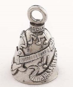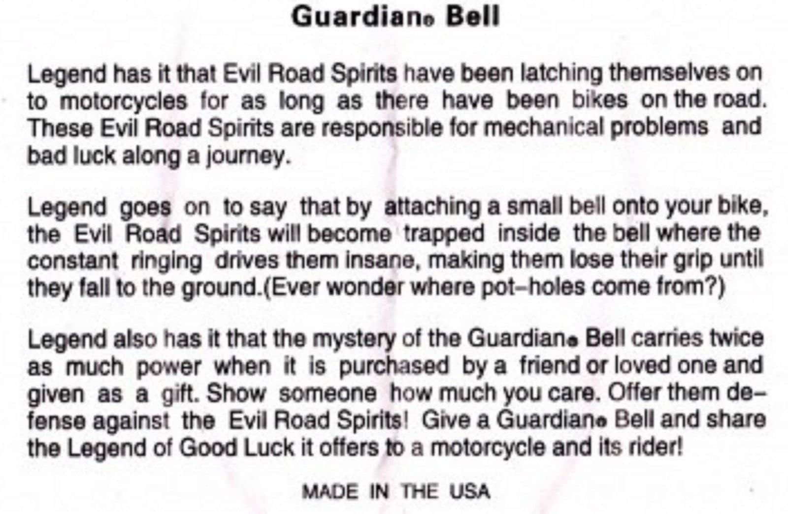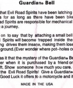 El Kit Completo de Guitarra Guardian Bell para Motocicleta incluye lo siguiente: 1- Guitarra Guardian Bell 1- Soporte Guardian Bell 1- Bolsa Guardian Bell 1- Tarjeta de Leyenda Guardian Bell Dentro de la Bolsa Guardian Bell 1- Pulsera Naranja Road Rash La Leyenda: La leyenda cuenta que una pequeña campana colocada en tu motocicleta, cerca del suelo, atrapa a los Malos Espíritus del Camino. Los pequeños Gremlins viven en tu motocicleta causando todo tipo de problemas mecánicos. El espacio de la campana atrae a estos Malos Espíritus, pero el constante sonido los vuelve locos y pierden su agarre cayendo al suelo. (¿Alguna vez te has preguntado de dónde vienen los baches?)