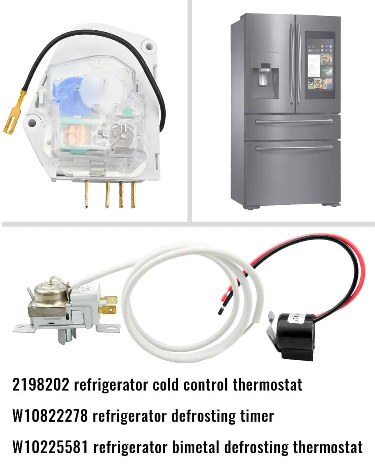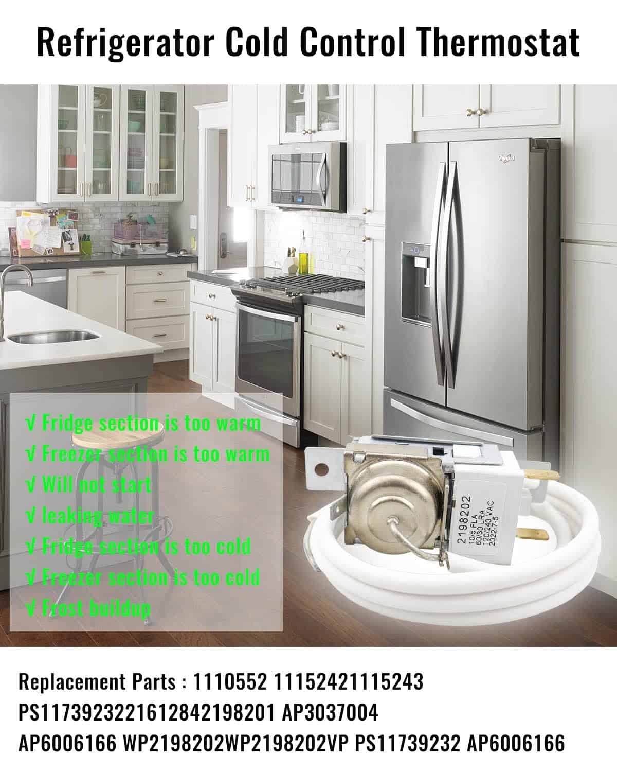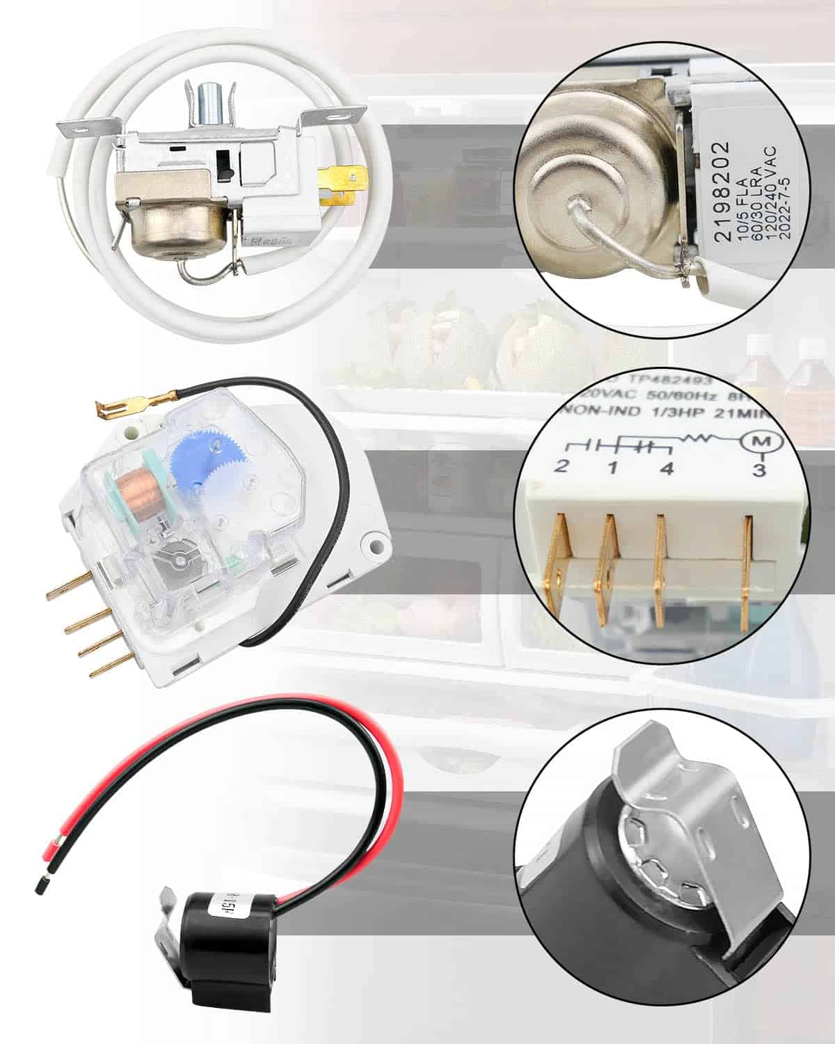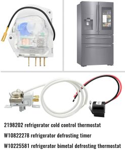 2. Número de Pieza de Repuesto: Termostato de control en frío 2198202 reemplaza a 1110552, 1115242, 1115243, 1115244, 1115245, 1129437, 2161283, 2161284, 2169112, 2169113, 2198201, 99989726, WP2198202, WP2198202VP, PS11739232, AP6006166, 115245, 1129437, 2161283, 2161284, 2169112, 2169113, 2198201, WP219829029, 269. Temporizador de descongelación W10822278 reemplaza a PS11723171, 945514, 482493, etc. Termostato bimetal W10225581 reemplaza a WPW10225581, PS11750673, 2149849, etc.