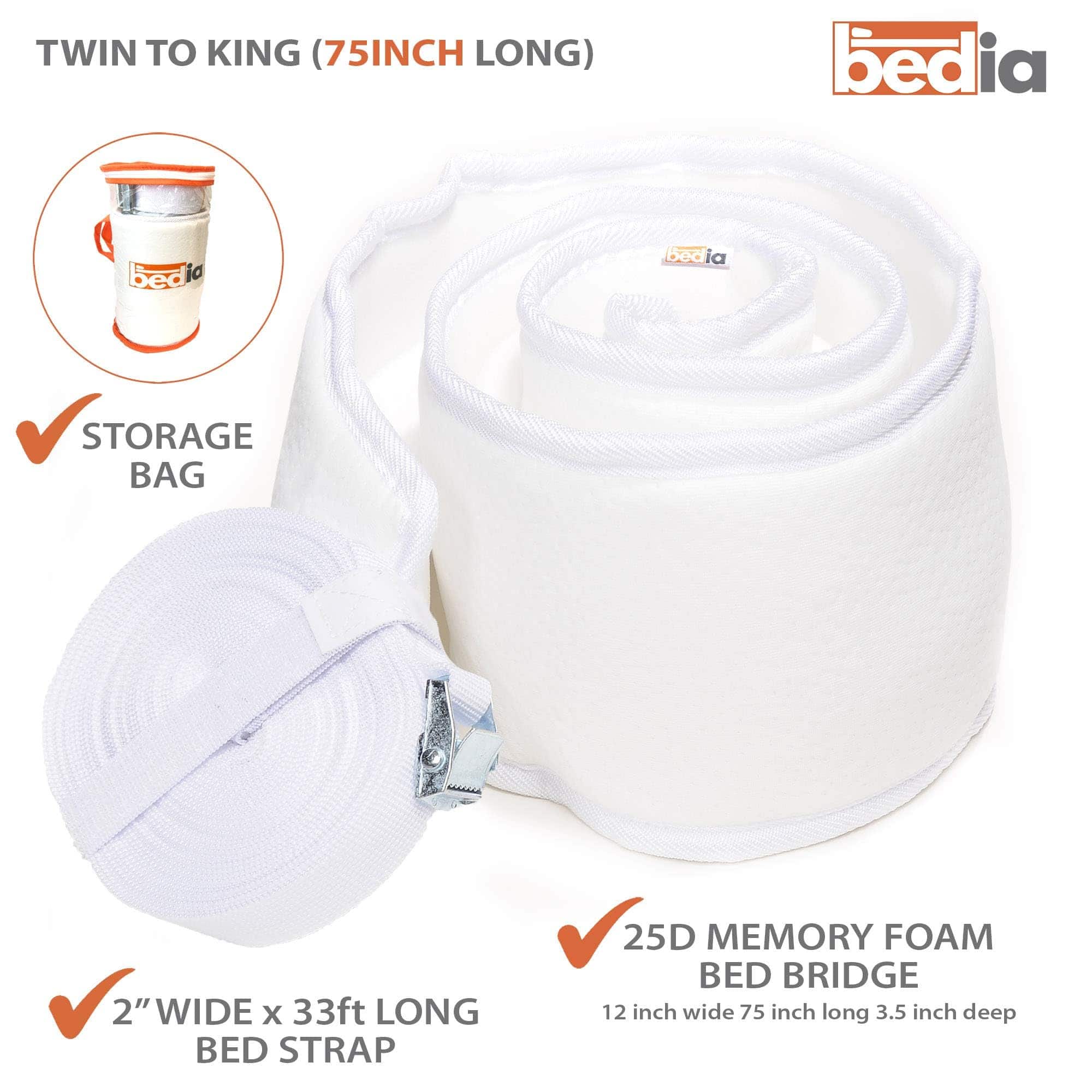 Los Sistemas de Duplicado de Cama Bedia están diseñados para obtener la máxima comodidad al dormir cuando deseas combinar camas más pequeñas en una grande. Los kits conversores de Bedia vienen con las almohadillas más anchas y suaves que previenen bultos y deslizamientos de la almohadilla. El sistema inteligente de cintas conecta la correa que ajusta las 2 camas y evita que la almohadilla se mueva libremente en la cama. ¡Compra con confianza!