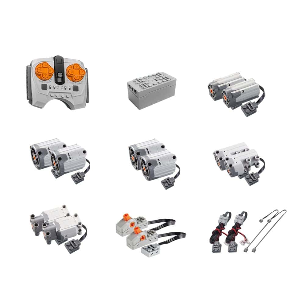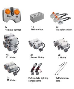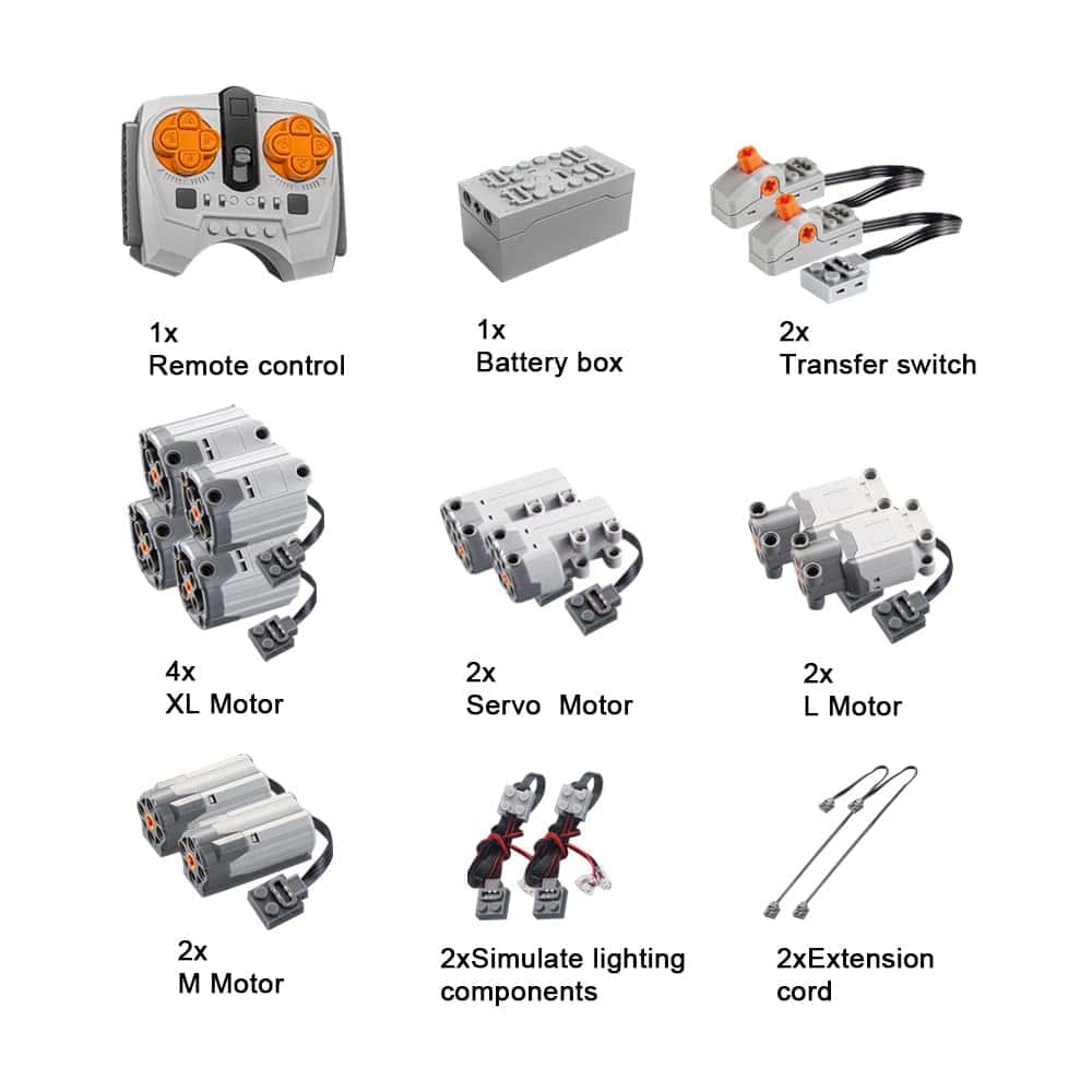 1. El kit de alimentación incluye: XL motor 4, servo motor 2, M motor 2, L motor 2, control remoto 1, caja de batería 1, cable de extensión 2, grupo de componentes luminosos 2, interruptor 2.