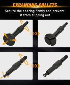 Incluido en el set están un martillo deslizante, un extractor de contrafuerte, un perno de repuesto, 3 adaptadores de tornillo y 10 colletas divididas en diferentes tamaños para adaptarse a una amplia gama de aplicaciones. Esta variedad permite a los usuarios quitar piezas con diámetros que van desde 1/4 hasta 2-1/3 pulgadas (6-59 mm).