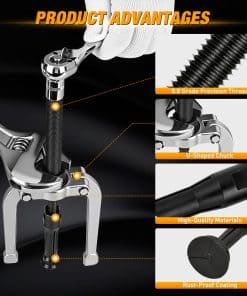 El extractor de rodamientos está fabricado con tecnología de forjado sólido y acero al carbono tratado térmicamente, lo que garantiza su resistencia y durabilidad. La superficie oxidada en negro proporciona protección contra la corrosión y altas temperaturas, asegurando su longevidad.