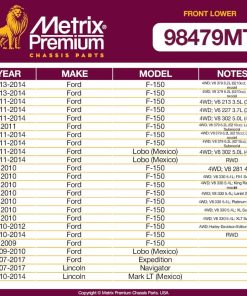 Este kit de 2 articulaciones inferiores de bola delanteras es compatible con una variedad de modelos de Ford F-150. Está pre-engrasado para una vida útil prolongada y un movimiento suave. Hecho de acero de alta calidad y diseñado para superar las especificaciones OEM, con certificación IATF 16949 e ISO 9001 para una fiabilidad y rendimiento superiores. Todas las partes de chasis premium de Metrix vienen con una garantía limitada de 3 años / 36,000 millas desde la fecha de instalación.