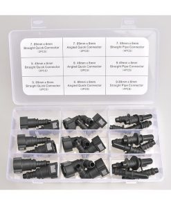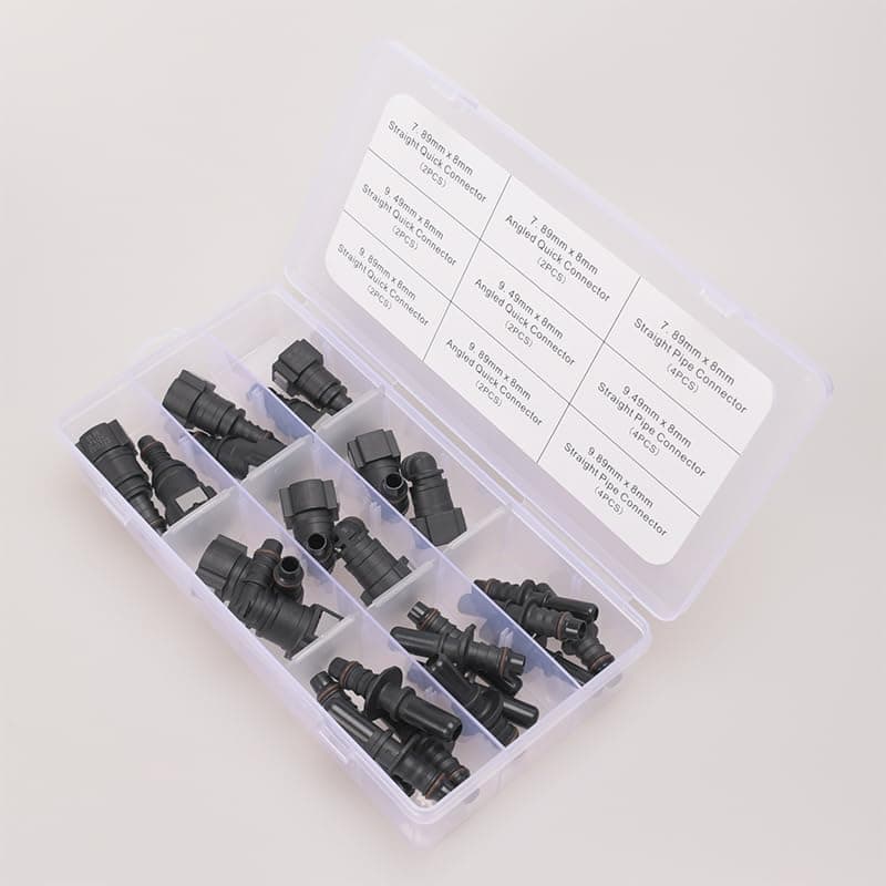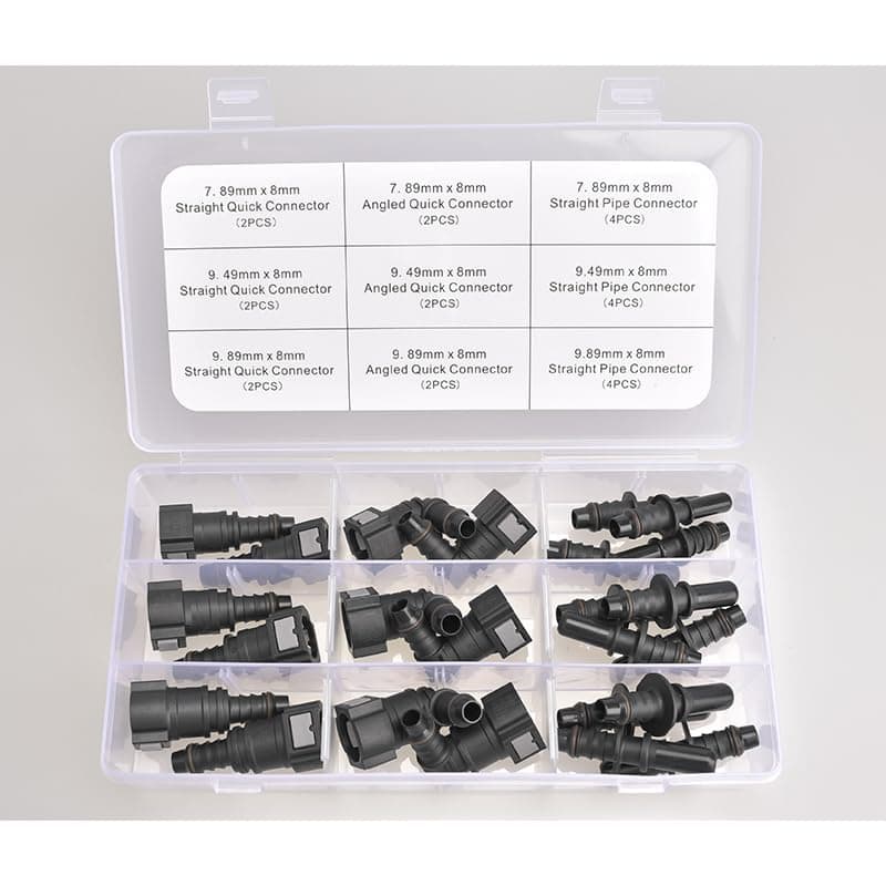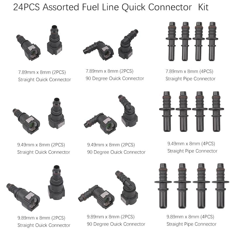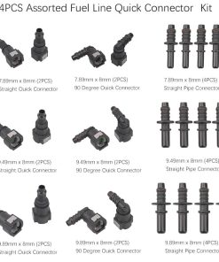 Kit de 24 conectores rápidos de línea de combustible que incluye una variedad de conectores para adaptarse a diferentes necesidades. Contiene conectores de 90 grados, conectores rectos y conectores de tubería recta para facilitar la instalación y el reemplazo de líneas de combustible. Los conectores están fabricados en nylon duradero y resistente para garantizar un rendimiento fiable. Ideal para reparaciones de sistemas de combustible en automóviles y otras aplicaciones. ¡Haz que el mantenimiento de tu vehículo sea más rápido y sencillo con este práctico kit de conectores de línea de combustible!