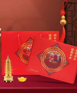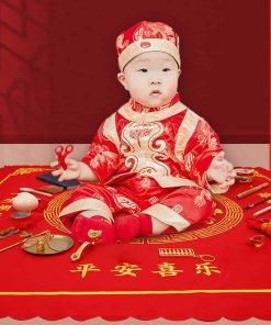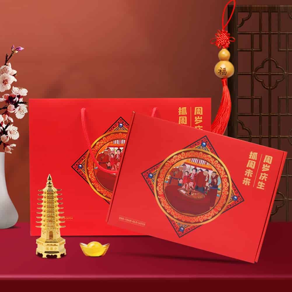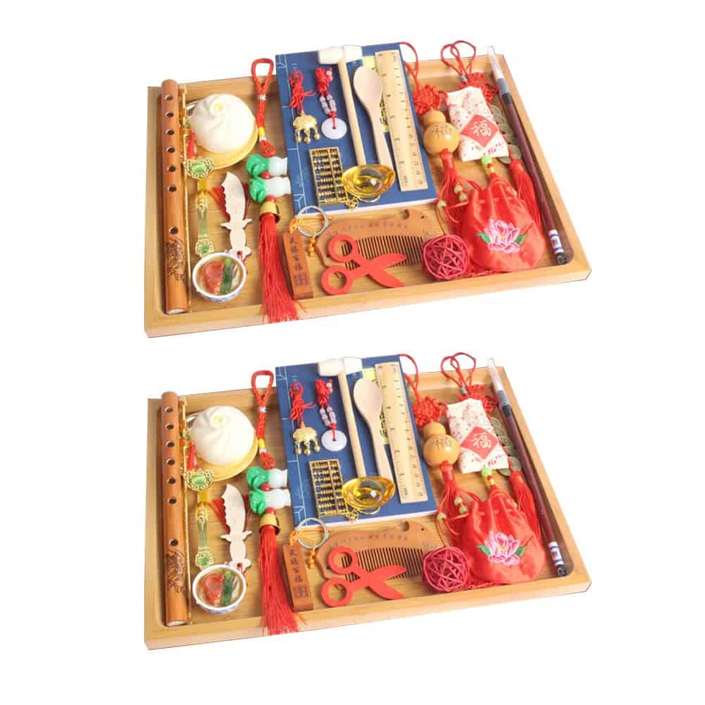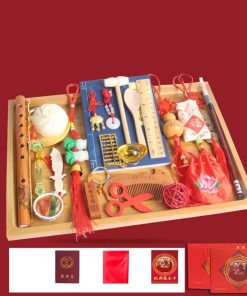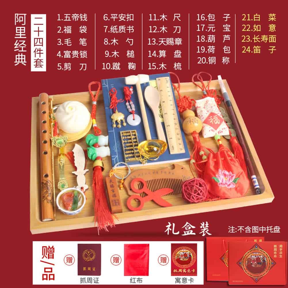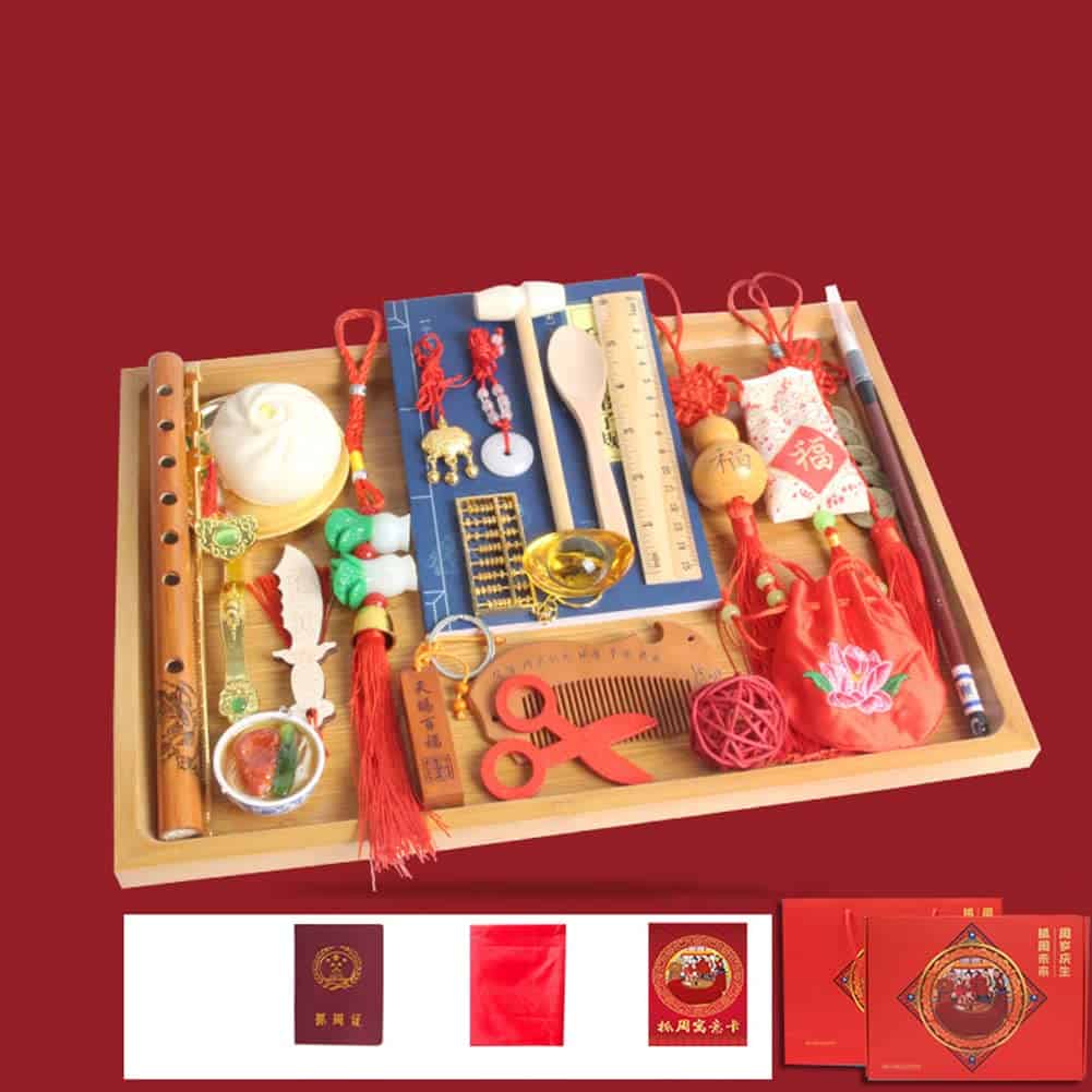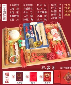 Incluye: 1. Libro 2. Cuchillo de madera 3. Regla 4. Cuchara 5. Broche de seguridad 6. Pincel 7. Sonajero 8. Cuju 9. Persecución de madera 10. Bolsa de la suerte 11. Tijeras 12. Candado de larga vida 13. Sello dado por Dios 14. Peine 15. Ábaco 16. Pan 17. Báscula de cobre 18. Lingotes 19. Calabaza 20. Dinero de los cinco emperadores 21. Dizi 22. Tintero redondo 23. Ruyi 24. Monedero
