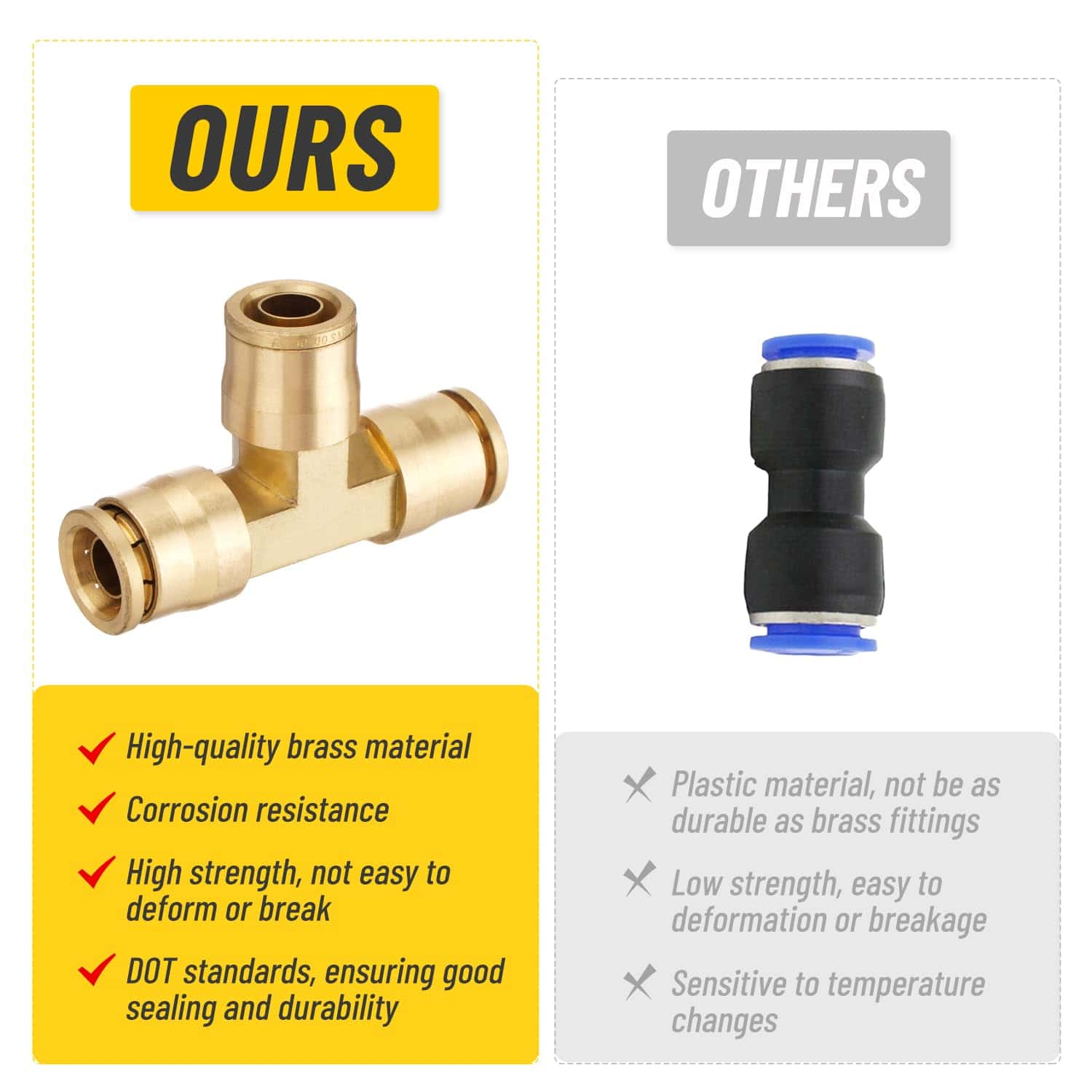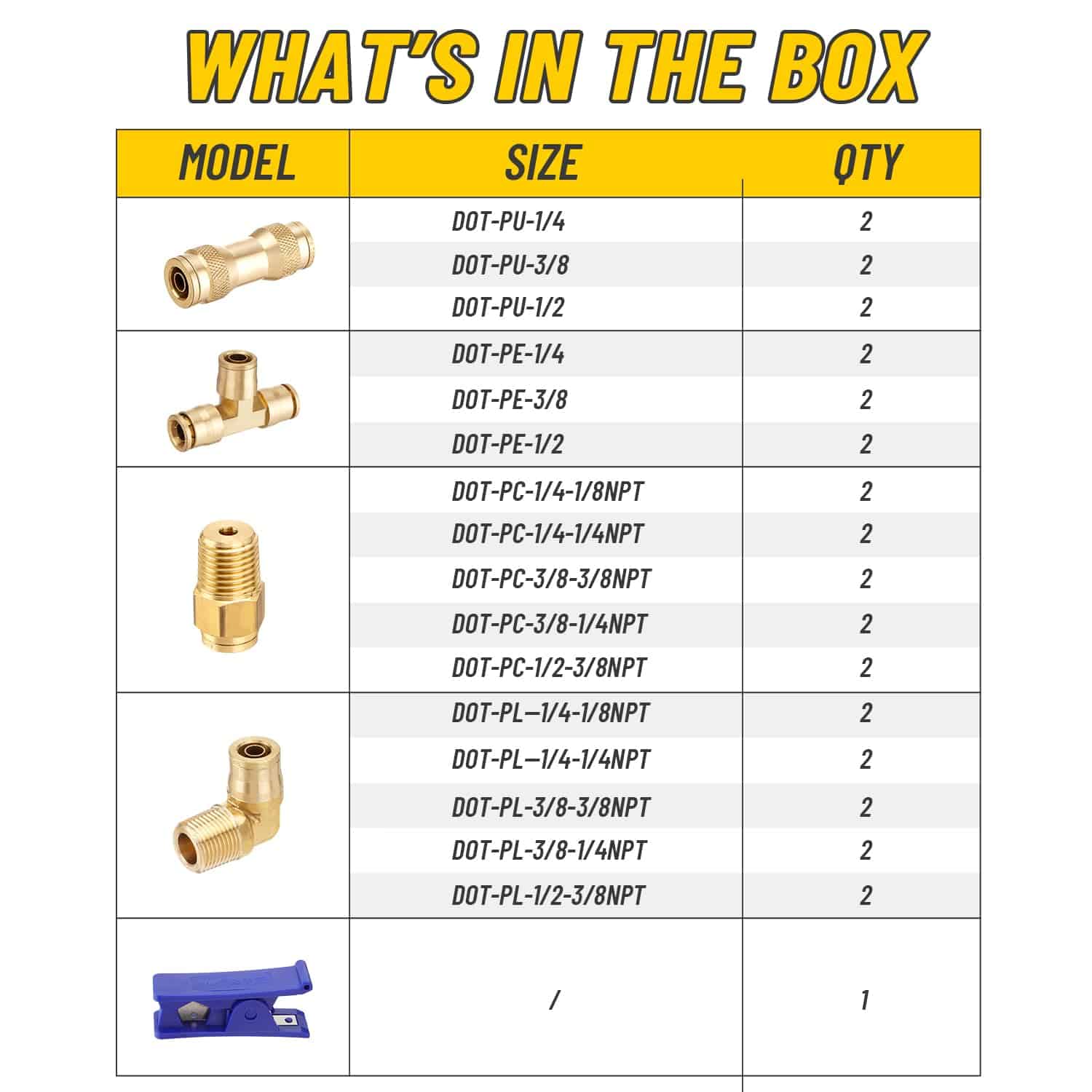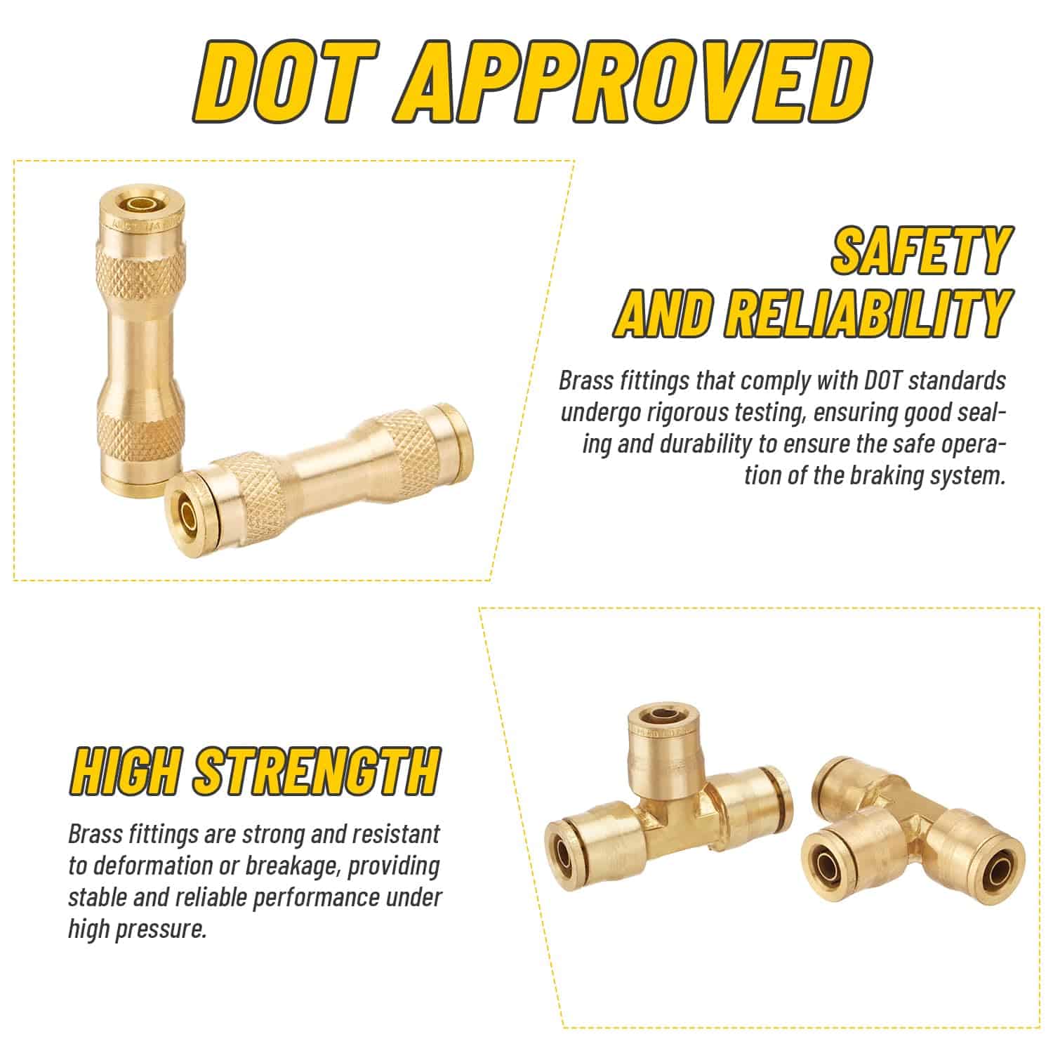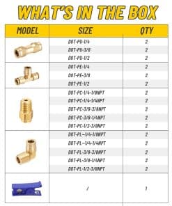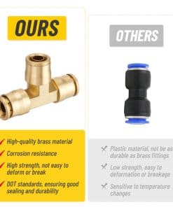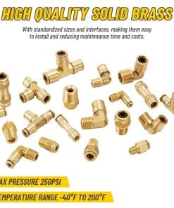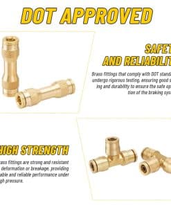 El kit de 33 piezas de Conexiones de Frenos de Aire DOT de Venussar incluye una variedad de conectores para adaptarse a diferentes tamaños de tubo de 1/4″, 3/8″, 1/2″. Estas conexiones de latón sólido son resistentes a la deformación y rotura, garantizando un rendimiento estable y confiable bajo alta presión. Pueden manejar presiones desde el vacío hasta 250PSI y temperaturas que van desde -40 F hasta +200 F. Las conexiones cumplen con los estándares DOT y han pasado por rigurosas pruebas de sellado y durabilidad para garantizar la operación segura del sistema de frenos. Con tamaños y interfaces estandarizados, estas conexiones de latón son fáciles de instalar, reduciendo el tiempo y costo de mantenimiento. Adecuadas para una amplia variedad de sistemas neumáticos y de frenos en camiones, remolques y más. Perfectas para talleres industriales, reparaciones de cortacéspedes, jardinería diaria, conexiones de mangueras de máquinas remolcadoras, entre otros usos.