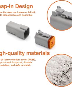 Los conectores DT están fabricados con Nylon Retardante de Llama (PA66), lo que los hace resistentes al agua y al polvo, asegurando una instalación segura en entornos difíciles. Los contactos sólidos de calibre de cable 14-20 AWG proporcionan una excelente estabilidad y conductividad, facilitando el engastado con cable y la instalación en el conector.