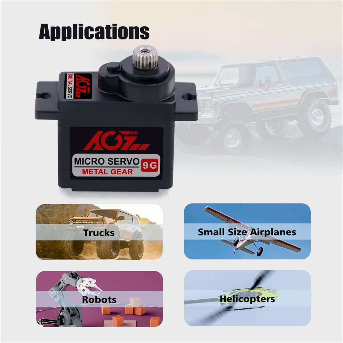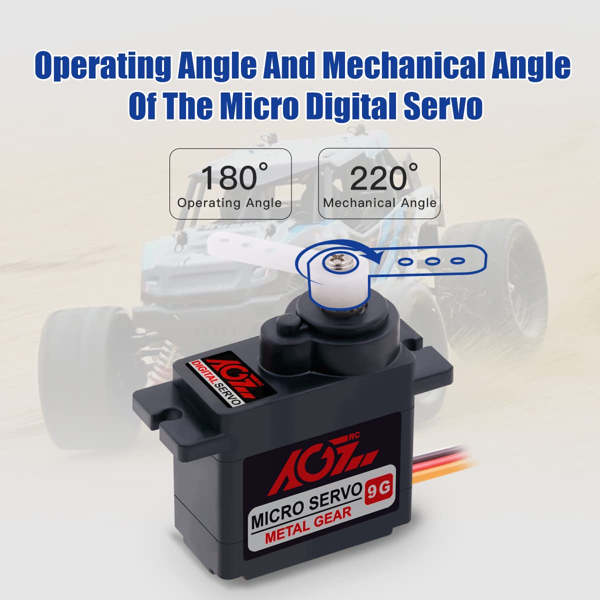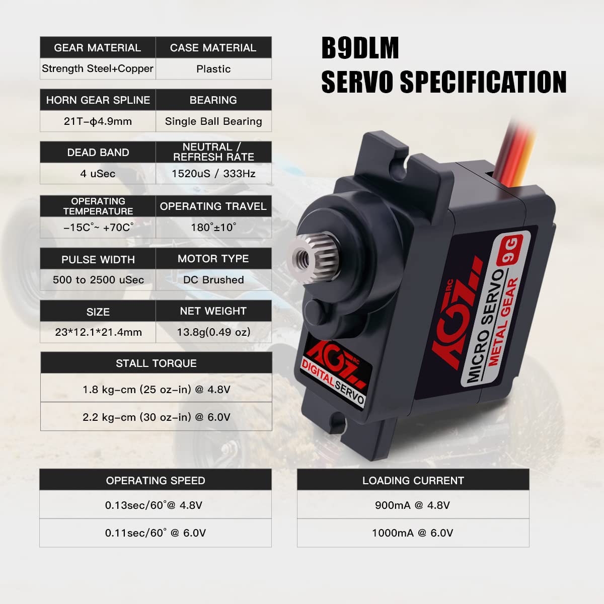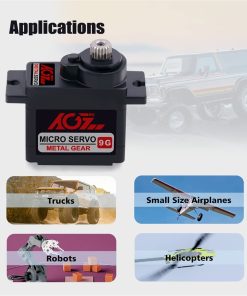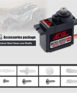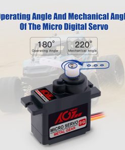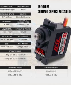 AGFRC B9DLM es un servo micro digital de alto rendimiento de 9g, con engranajes de metal de alta durabilidad y estriado de acero de 21T, que produce un par de torsión de 2.2KG y una velocidad de 0.11seg a 6V. Puede trabajar entre -15 grados y 70 grados de temperatura. El ángulo de operación máximo de 180° puede cumplir con la mayoría de los requisitos, siendo perfecto para la mayoría de los aviones RC de tamaño pequeño, coches, helicópteros, robots, etc.