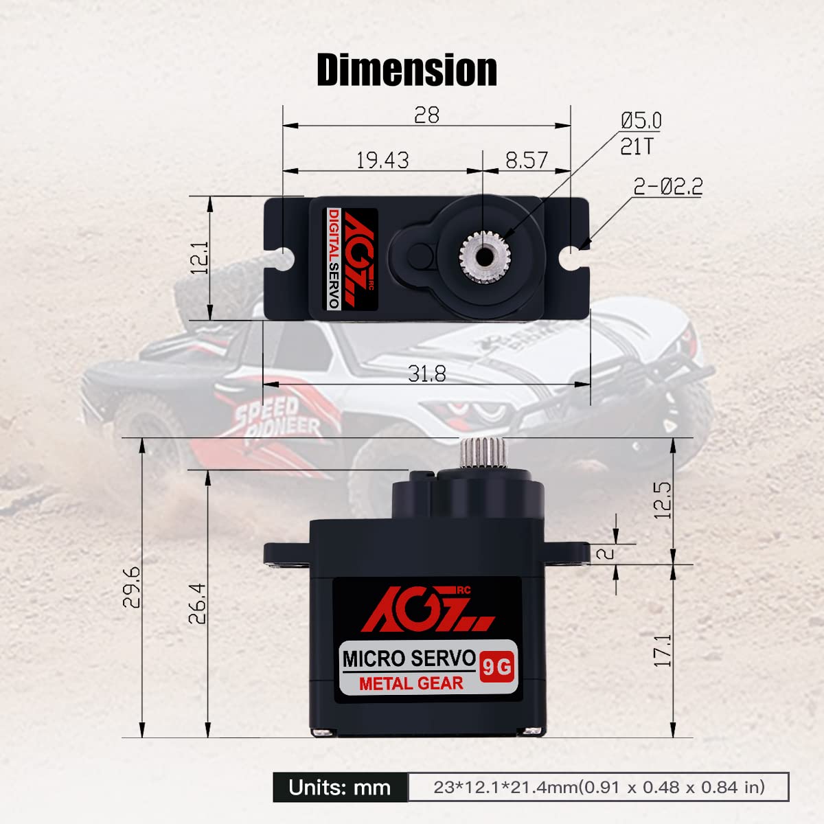 Especificaciones Marca: AGFRC Sistema de Control: PWM Posición Neutral: 1520uS Tasa de Actualización: 333Hz Banda Muerta: 4 uSec Voltaje de Operación: 4.8V ~ 6.0V Recorrido de Operación: 180° ± 10 , 500 a 2500 uSec Estribo del Cuerno: 21T- 4.90mm Material de la Carcasa: Plástico Material del Engranaje: Acero Resistente + Cobre Peso: 13.8g (0.49 oz) Cable: JR 180mm / 26AWG Tamaño: 23 12.1 21.4mm(0.91 x 0.48 x 0.84 in)
