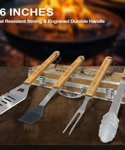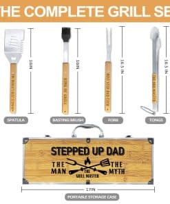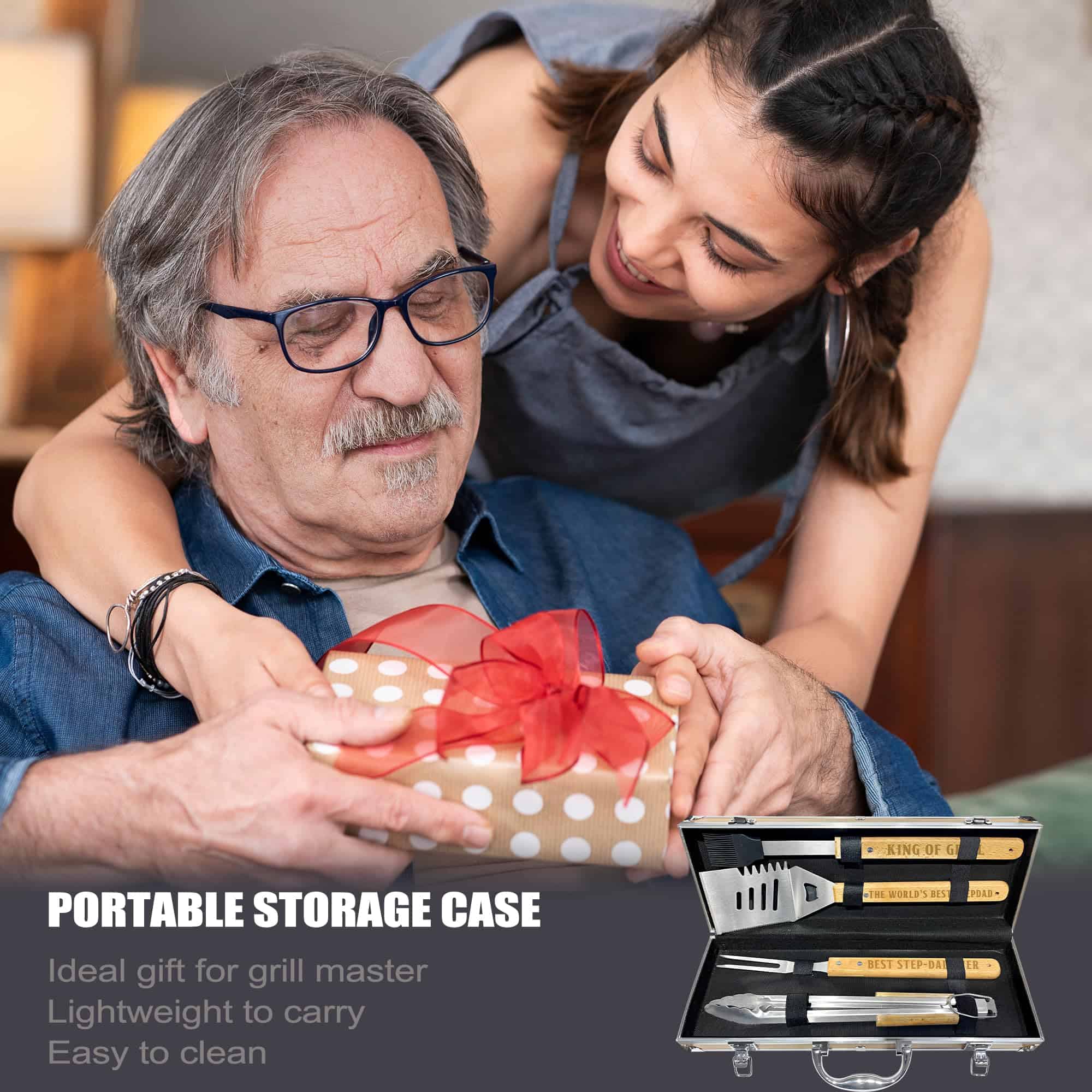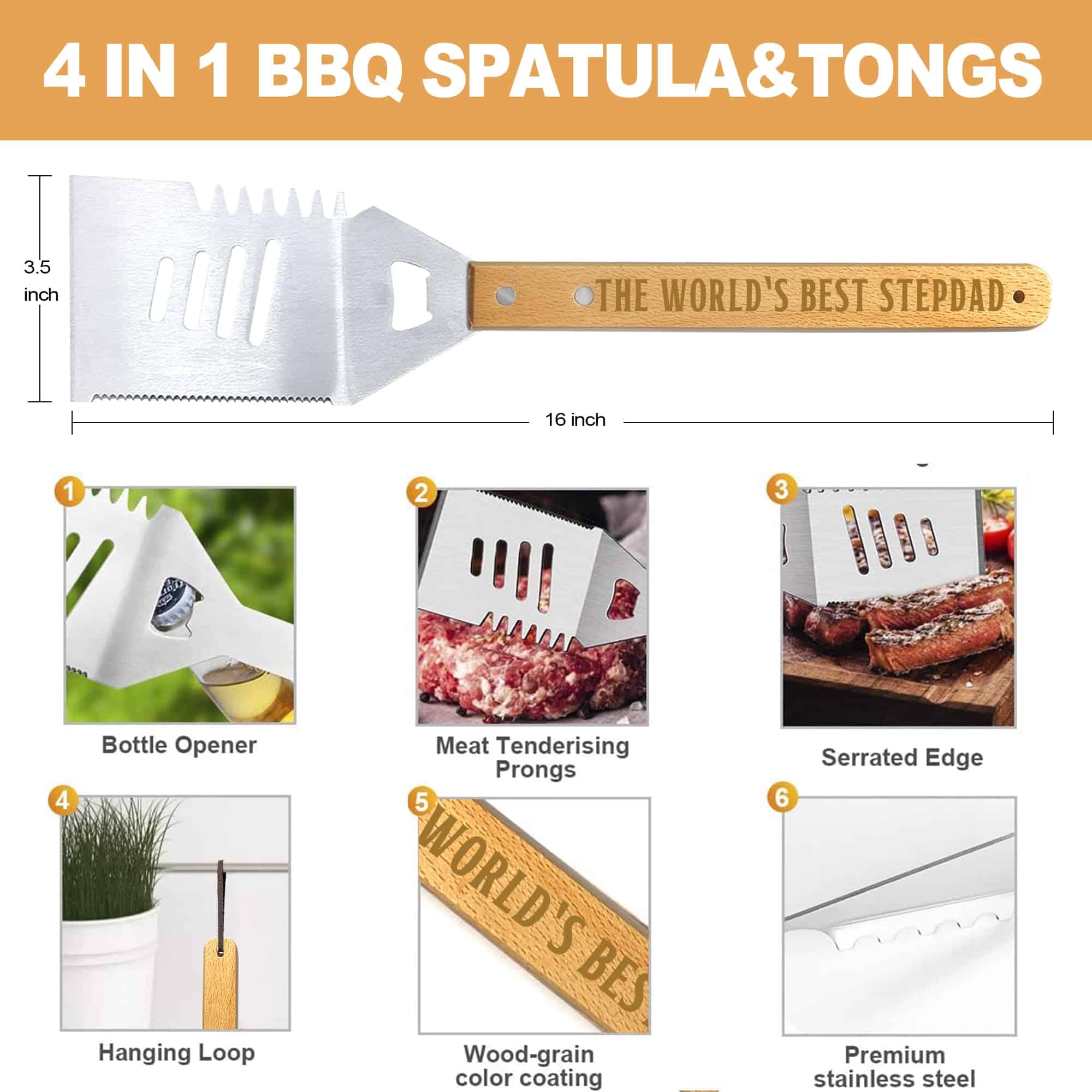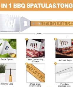 El lujoso kit de herramientas de barbacoa para el patrastro está diseñado para durar toda la vida, fabricado con acero inoxidable de alta calidad extra grueso que nunca se oxidará, doblará o romperá. Es un kit básico de herramientas de barbacoa preparado para el patrastro que ama la barbacoa, incluyendo 1 espátula multiusos, 1 tenedor para parrilla, 1 par de pinzas y 1 pincel de cocina. Todas las herramientas vienen en un resistente estuche de aluminio, perfecto para usar sobre la marcha o en casa. Su exclusivo diseño exterior presenta una elegante frase diseñada para el patrastro, con un acabado clásico de madera que complementa cualquier entorno interior o exterior. Las herramientas de barbacoa cuentan con un diseño de mango de madera natural con un tacto suave, y el acero inoxidable forjado es resistente y duradero, lo que facilita el manejo de grandes piezas de carne. Todos los utensilios de barbacoa están fabricados con acero inoxidable profesional de alta calidad, resistente al calor y diseñados para resistir un uso repetido sin doblarse o romperse. Son duraderos, lo que los convierte en el regalo perfecto para el patrastro que es un maestro en la parrilla y un entusiasta de la barbacoa. Las pinzas y la espátula son resistentes pero ligeras, con mangos extendidos para mantener una distancia segura del fuego, por lo que no hay que preocuparse por quemaduras. El set incluye todo lo necesario para las barbacoas en el patio trasero, y es apto para lavavajillas para una fácil limpieza después de cada uso, por lo que podrás seguir utilizándolo la próxima vez.