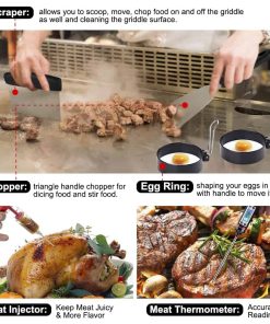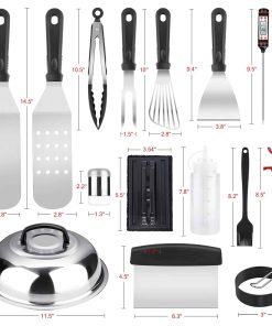 1. Premium Acero Inoxidable: La plancha de metal para parrilla está hecha de acero inoxidable 304 de alta calidad para asegurar que los accesorios para parrilla sean compatibles con la plancha Blackstone, libre de BPA, duradero, a prueba de óxido, puedes usarlo con confianza. 2. Conjunto Más Completo: Nuestro set de BBQ de 121 piezas es el conjunto de accesorios para parrilla más completo del mercado, que puede satisfacer todas tus necesidades. Incluye espátula, espátula ranurada, tapa de asar, pinzas para parrilla, tenedor para parrilla, pincel para basting, volteador de pescado, picador, raspador, 2 dispensadores de salsa (16 oz), 2 anillos para huevos, 2 esparcidores de especias, tijeras, guantes de silicona, termómetro de carne, inyector de carne, 100 brochetas de bambú, cepillo de limpieza, bolsa de almacenamiento. 3. Las Herramientas Necesarias: Espátulas, raspador y botellas de aceite son herramientas necesarias para cualquier chef de parrilla serio. La larga espátula para parrilla puede mover grandes cantidades de comida rápida y precisamente. Chopper/raspador para picar alimentos y limpiar placas. Complacerá a todos en tu BBQ, fiesta de fin de semana o en tus comidas diarias. 4. Las Herramientas Extra: El anillo para huevos puede dar forma a tus huevos en redondo que es más delicado; la tapa de fundición de 12 pulgadas ayuda a reducir el tiempo de cocción y las salpicaduras; el tenedor tiene cola afilada que ayuda a pinchar cualquier cosa con el mínimo esfuerzo; Volteador de pescados no solo es sólido sino también delgado y flexible para que puedas levantar la comida delicada como el pescado sin destruirlo. 5. Regalo Perfecto: Embalaje de calidad en una hermosa caja de regalo, que es la elección ideal para el Día del Padre, Acción de Gracias o Navidad. Respaldamos nuestro Kit de Accesorios para Parrilla con nuestro excepcional servicio al cliente, si alguna vez tienes un problema, no dudes en contactarnos.