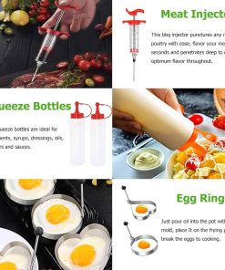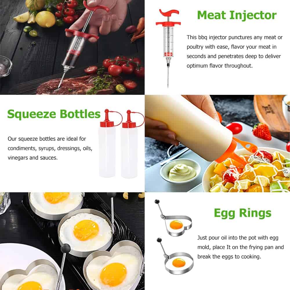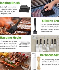 Kit completo de accesorios para parrilla de 131 piezas. Incluye cubierta de baño María, espátula, espátula ranurada, rascador, picador, vuelta de pescado, tenedor, pinzas, inyector de carne, pinceles de baño María, cepillos limpios, anillos de huevo, dispensador de salsa, espolvoreador, sujetadores de maíz, cuerdas de acero inoxidable, cuerdas, ganchos, caja de regalo y bolsa de almacenamiento.