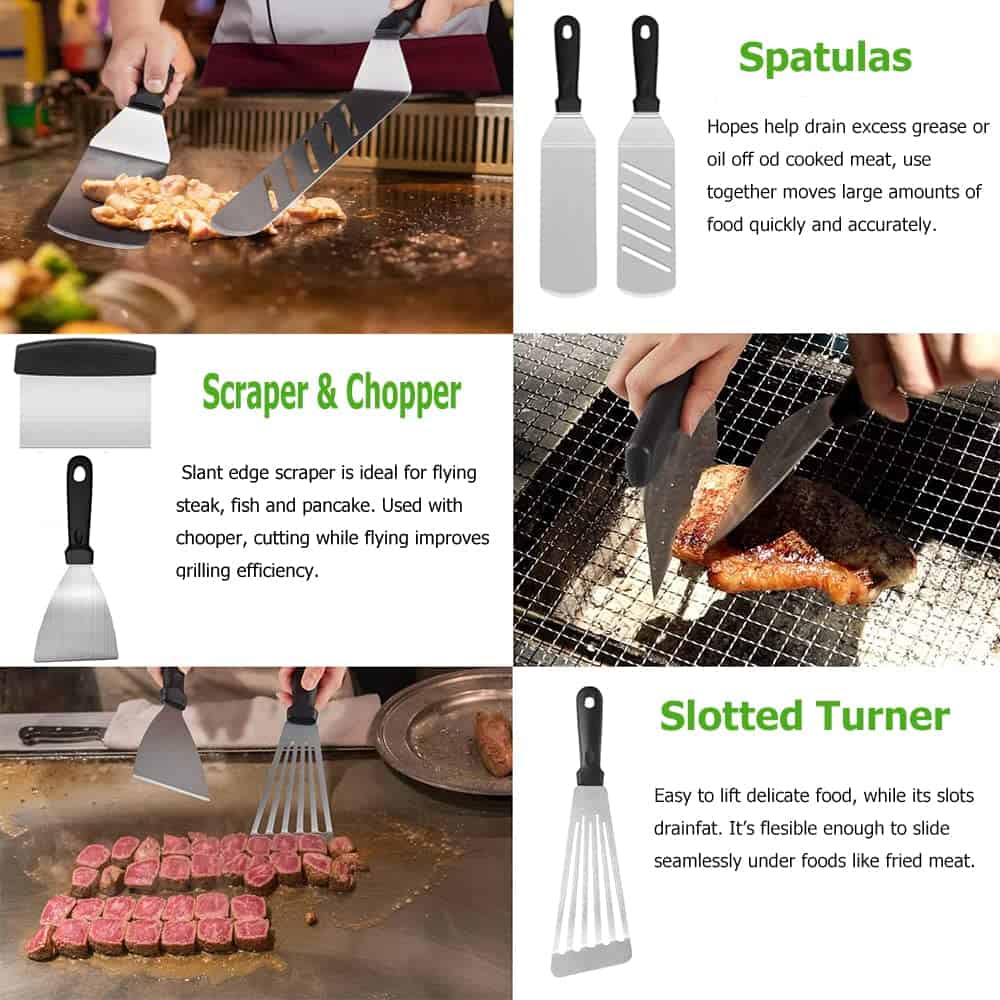 Conjunto de accesorios para parrilla de grado Premium de acero inoxidable duradero. Cuenta con un acabado brillante y resistente a la oxidación para una durabilidad duradera. Las asas de ABS resistentes al calor y antideslizantes proporcionan un agarre cómodo, con agujeros para colgar para un almacenamiento fácil. El juego de accesorios para parrilla es apto para lavavajillas y se limpia rápidamente. Los raspadores, espátulas y botellas de aceite son herramientas necesarias para parrillas planas. Las espátulas para parrilla pueden mover grandes cantidades de alimentos rápidamente y con precisión. El picador/raspador para trocear alimentos y limpiar parrillas. Las espátulas cónicas/manejos cónicos manejarán bien tus necesidades de troceo y limpieza de parrilla. Los anillos de huevo y otras herramientas de barbacoa te ayudarán a desempeñarte bien en la cocina de barbacoa. El kit de espátulas para parrilla es apto para lavavajillas o se puede lavar fácilmente a mano con agua y jabón para que puedas disfrutar de una deliciosa barbacoa con tu familia sin problemas. Nota: Después de lavar el raspador de parrilla plana en el lavavajillas o a mano, asegúrate de secarlos para garantizar su larga vida útil. Con una bonita caja de regalo, este kit de accesorios para parrilla puede ser un regalo ideal para familiares y amigos en cumpleaños, bodas, el día de San Valentín, el día del padre, el día de la madre, Navidad y todas las demás festividades. El set de parrilla es el mejor regalo para hombres. Una elección de regalo de parrilla única para el Día del Padre, Acción de Gracias o Navidad.