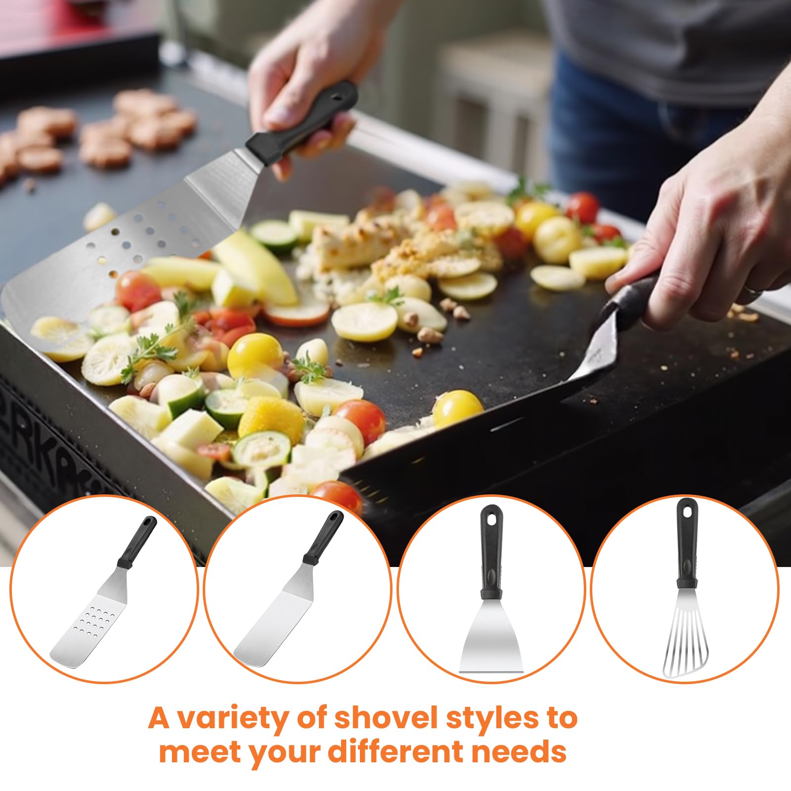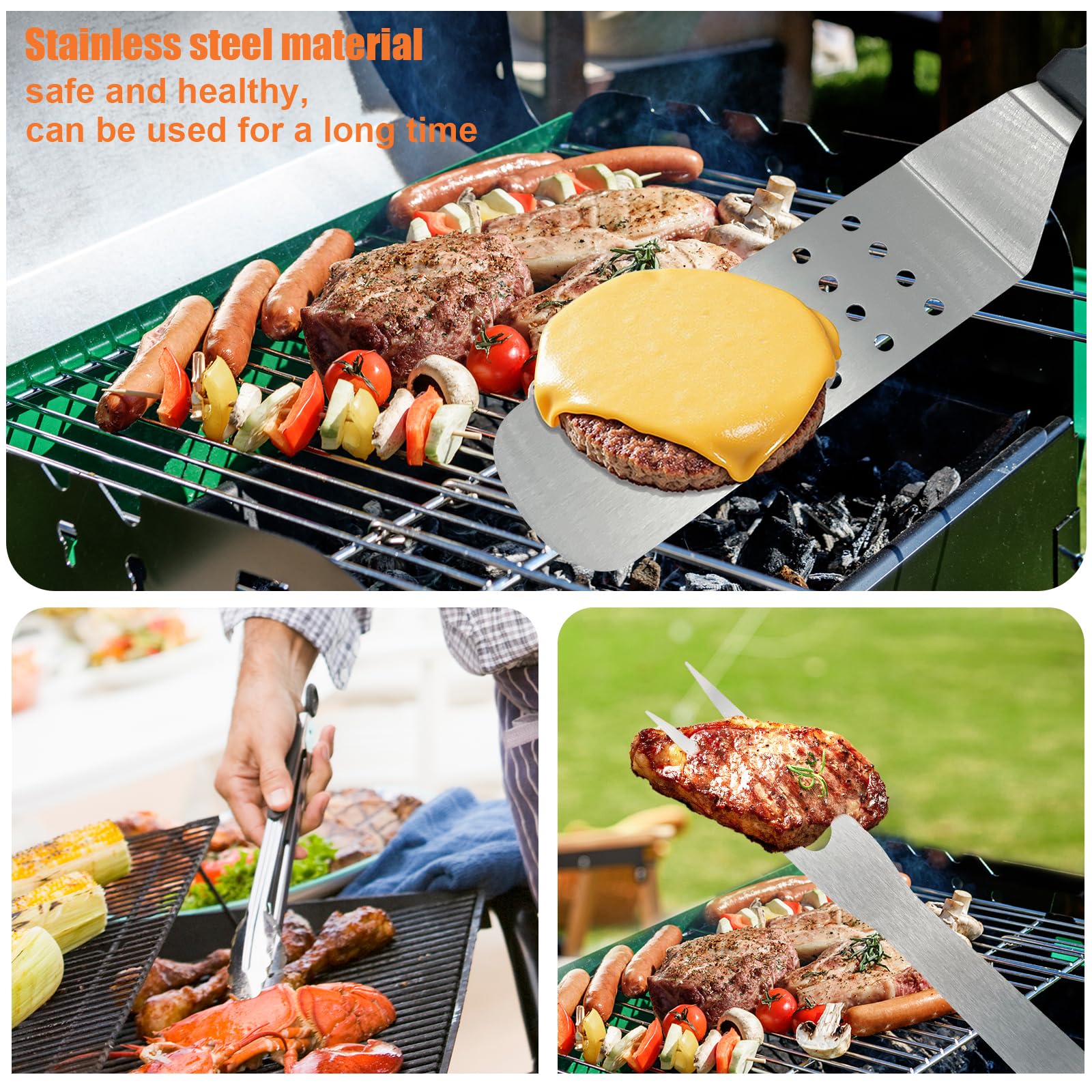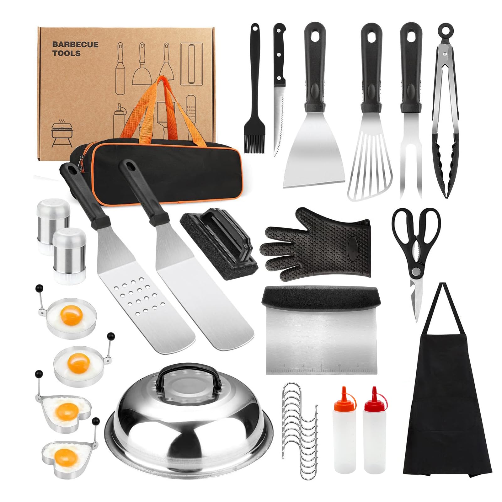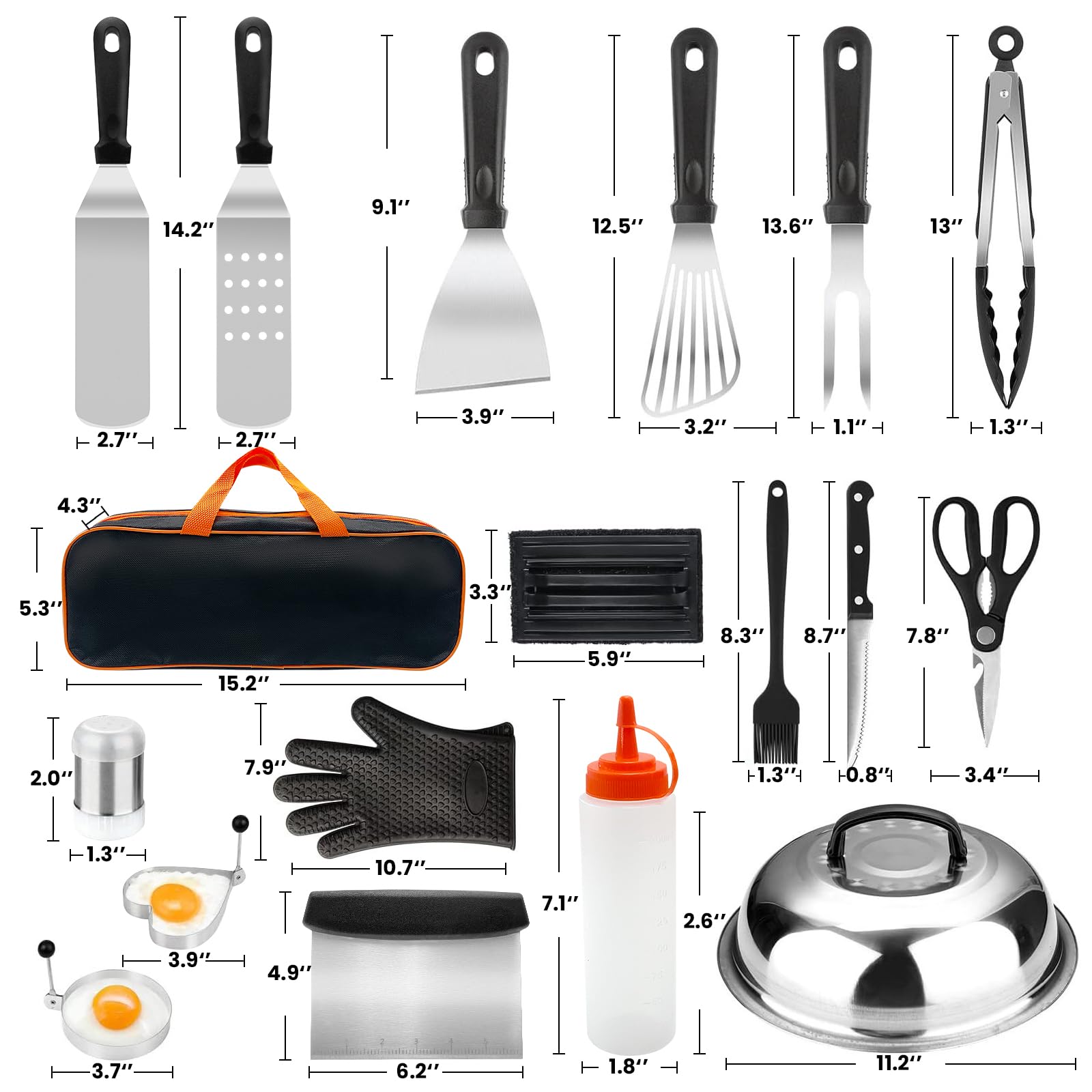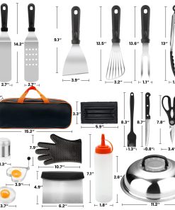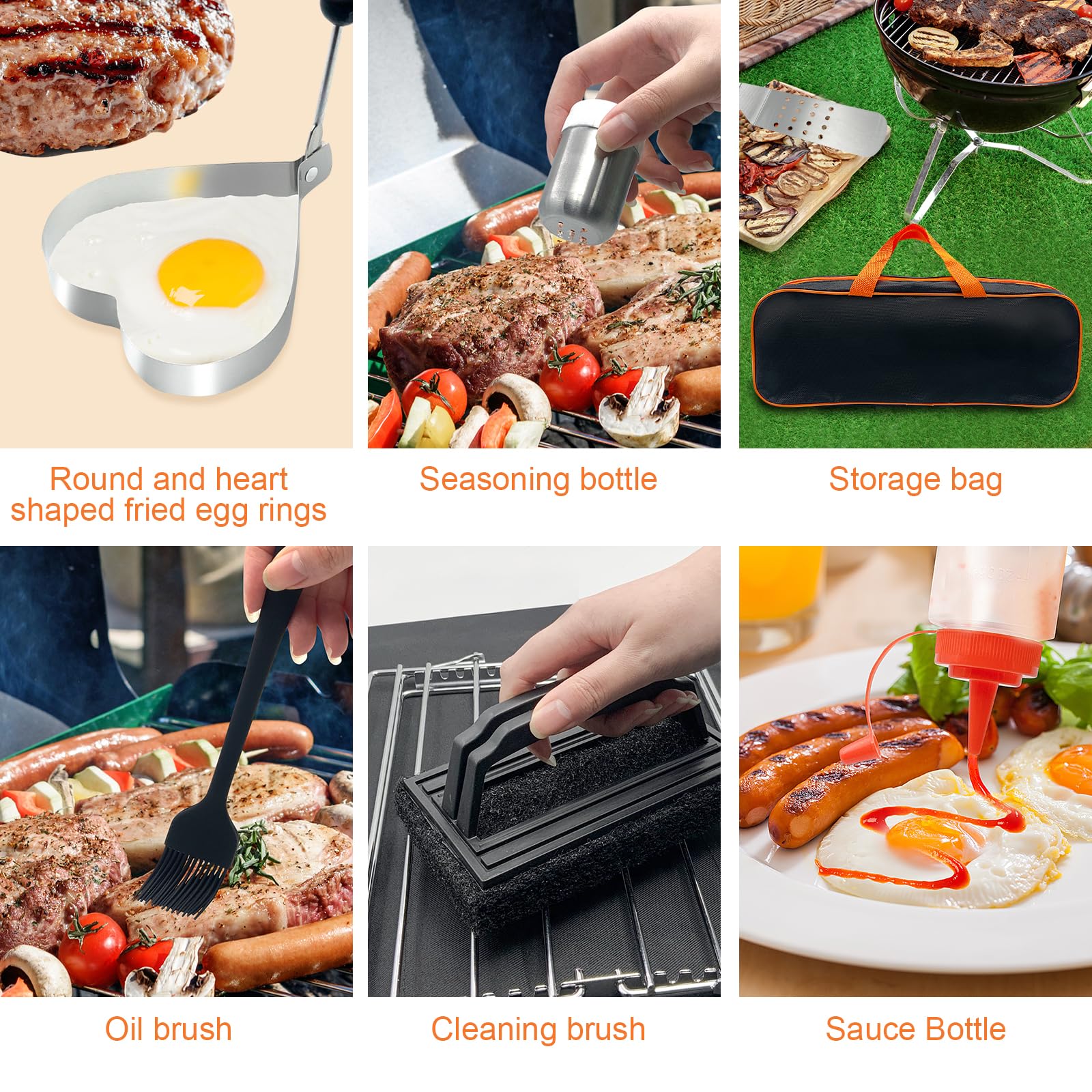 Características: El set tiene accesorios completos, lo que lo convierte en un gran regalo para vacaciones para familiares y amigos. Tiene una variedad de usos, no solo para barbacoas, sino que algunos accesorios también son adecuados para uso diario en la cocina. Material: acero inoxidable, PP El set incluye: 2 botellas exprimibles 1 delantal 2 botellas de condimentos 1 par de tijeras 2 anillos de huevo redondos 2 anillos de huevo en forma de corazón 10 ganchos 1 tapa de olla 4 espátulas con diferentes funciones 1 cepillo de limpieza 1 cuchillo dentado 1 pincel de aceite 1 clip 1 guante 1 bolsa de almacenamiento 1 cortador de masa 1 tenedor para tostar 1 caja