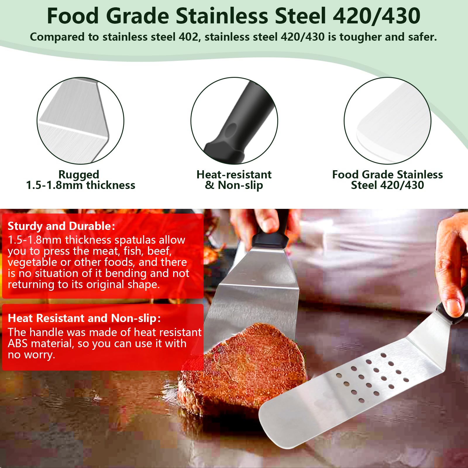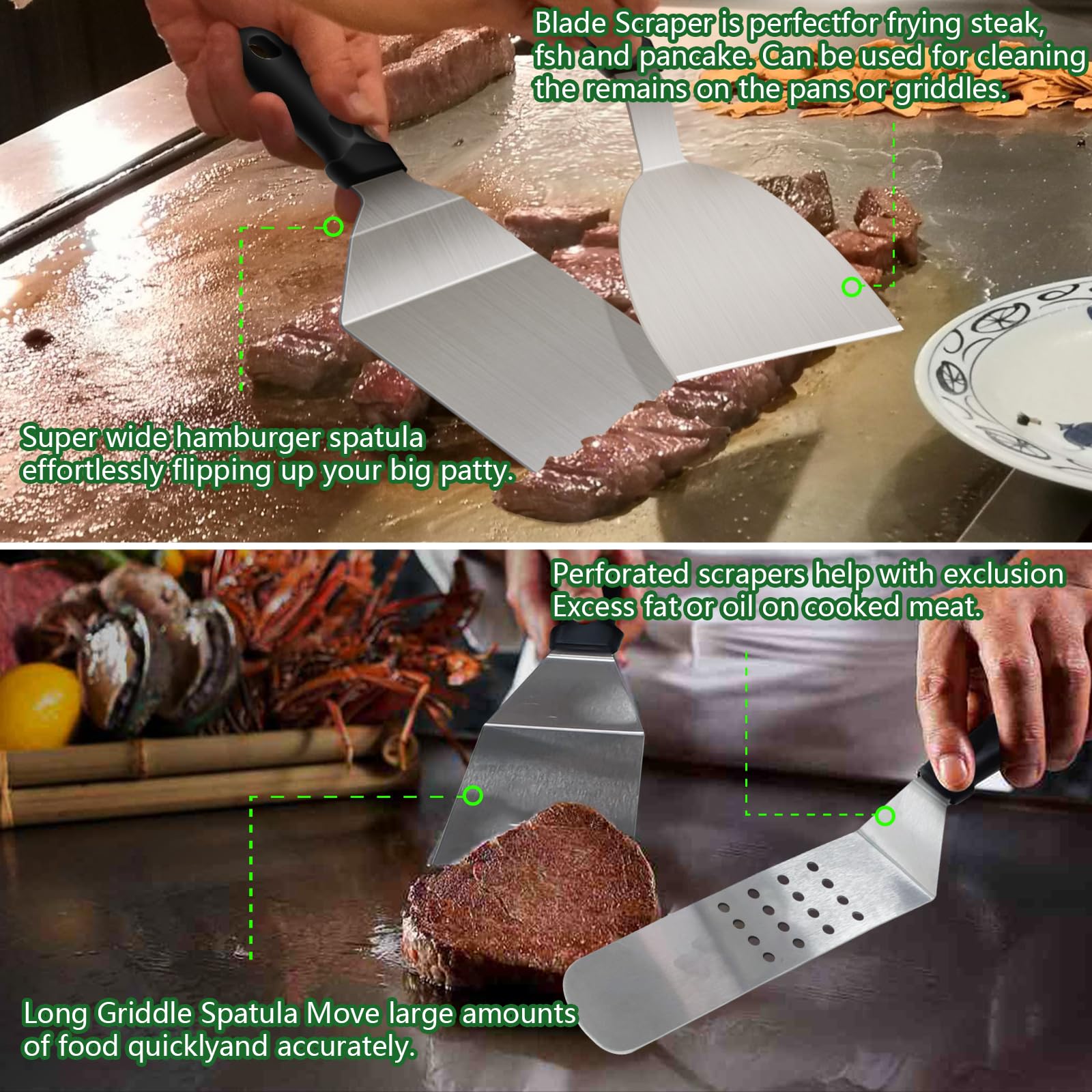 SET DE HERRAMIENTAS DE PARRILLA DE ACERO INOXIDABLE PREMIUM 420/430 En comparación con otros aceros inoxidables en el mercado, nuestro set de accesorios para parrilla está hecho de acero inoxidable de alta calidad 420/430, con un grosor de 1.2-1.5mm, resistente al calor y a la oxidación, más seguro y duradero que otros accesorios para parrilla. Acampar o cocinar sin preocuparse de que sus herramientas se doblen, rompan o se oxiden de nuevo. Libre de BPA. Los mangos ergonómicos permiten un agarre fresco y cómodo durante mucho tiempo. FÁCIL DE TRANSPORTAR Y ALMACENAR Nuestro kit de herramientas para parrilla es apto para lavavajillas, o se puede lavar fácilmente a mano con agua y jabón, para que puedas disfrutar de una deliciosa barbacoa con tu familia sin problemas. Cada herramienta puede ser colocada de manera ordenada y mejor protegida en la bolsa de almacenamiento compacta y una caja de regalo exquisita. Se proporcionan perchas convenientes para un fácil almacenamiento y herramientas para parrilla de grado alimenticio se limpian fácilmente con agua tibia y jabón. ELECCIÓN IDEAL PARA LA FAMILIA Y EL RESTAURANTE Nuestro set de herramientas para parrilla con rascador, espátulas y botellas de aceite son herramientas necesarias para la parrilla Blackstone que te ayudarán a asar tan fácilmente como un chef de restaurante. Ideal para voltear hamburguesas, panqueques, verduras, cortar pan, carne y salchichas, rascador y picadora para picar alimentos y limpiar las parrillas. La espátula larga para parrilla puede mover grandes cantidades de comida de manera rápida y precisa. Anillos para huevos y esparcidores de pimienta para mejorar tu experiencia de cocina en la parrilla. ELECCIÓN DE REGALO PARA EL CHEF Nuestro set de herramientas de barbacoa viene con una caja de regalo exquisita, que es un regalo ideal para padres, chefs, principiantes, entusiastas del camping. La caja de regalo especialmente diseñada tiene un aspecto más elegante y es una excelente elección para Navidad, cumpleaños, aniversarios. ¡El kit de accesorios para parrilla POLSMTX hace que tu trabajo en la parrilla sea más simple!