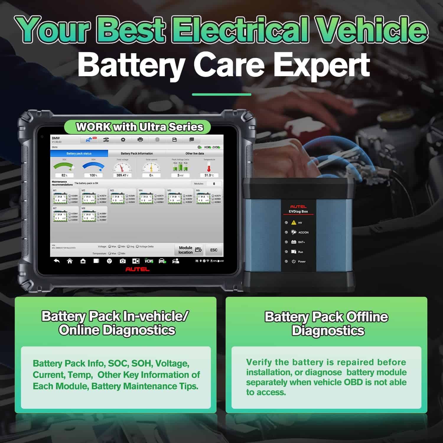 3. ANÁLISIS PROFUNDO DEL PAQUETE DE BATERÍA EV Al utilizar la Caja EVDiag con Autel Ultra/ MS919/ MS909, puede realizar un análisis completo en los paquetes de baterías EV. La prueba del paquete de baterías se puede realizar a través de OBD del vehículo o directamente en el paquete de baterías con cables y puente incluidos, el Autel Ultra EV/ MS909EV actualizado proporcionará información del paquete de baterías, SOC, SOH, Voltaje, Corriente, Temporizador, consejos de mantenimiento de baterías, etc., todo con gráficos detallados y guía de conexión para proporcionar pruebas seguras y seguras.