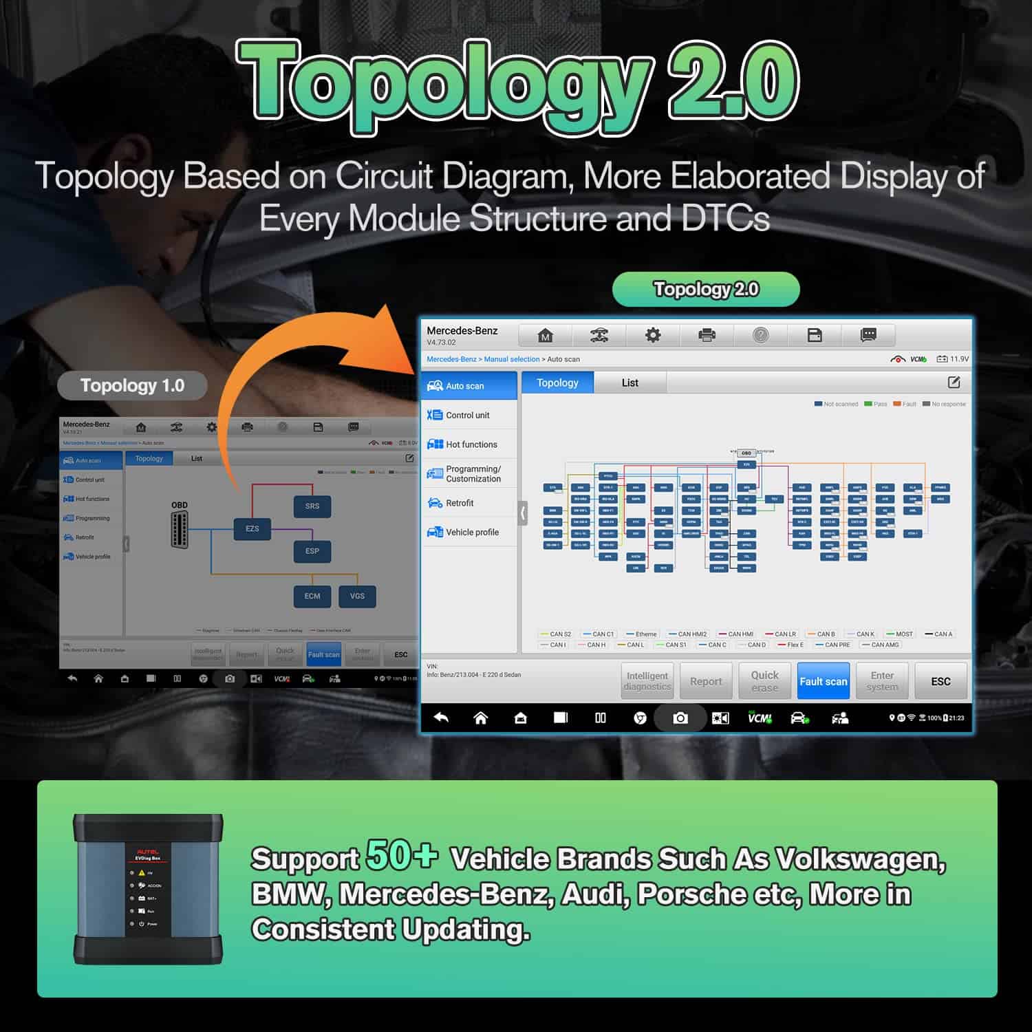 4. ACTUALIZACIÓN A TOPOLOGÍA 2.0 CON CAJA EV Al utilizar la Caja EVDiag con Autel Ultra/ MS919/ MS909, tendrá acceso a la nueva topología actualizada 2.0, creando un nuevo diagrama topológico basado en el diagrama de circuito y completado con la configuración del vehículo, mostrando estructuras de topología de uno a uno, exactamente precisas y confiables como el software OE. Topología 2.0 trabaja con más de 50 marcas de vehículos de automóviles eléctricos y más en actualizaciones consistentes.