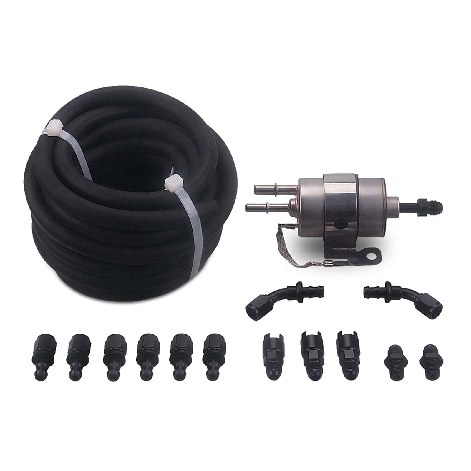 Este completo kit de línea de combustible de conversión LS viene con 25 pies de manguera de inyección de combustible adecuadamente calificada y todos los adaptadores correctos para conectar las líneas de combustible desde la bomba de combustible hacia adelante. Todos los adaptadores cuentan con un conector reutilizable de bloqueo giratorio que no requiere herramientas especiales para desmontar. Se recomienda una instalación profesional, no se incluyen instrucciones. Diámetro Exterior de la Manguera de Combustible: 6.30 pulgadas/16mm Diámetro Interior de la Manguera de Combustible: 3.74 pulgadas/9.5mm Longitud de la Manguera de Combustible: 25 pies/7.5m Presión de Trabajo de la Manguera de Combustible: 217.5-290 PSI Aplicación: apto para gasolina y diésel Filtro/regulador de combustible LS: Este filtro de combustible cuenta con una derivación interna que regula la presión de salida del combustible a 58 psi (4 bar). El filtro cuenta con una entrada macho de 3/8, una salida de retorno macho de 5/16 y una salida de suministro hembra de 3/8. Esta combinación de accesorios facilita la plomería simple de sistemas de combustible para conversiones LS Swaps y EFI de mercado secundario. Tasa máxima de flujo de bomba de combustible de 255LpH. Paquete Incluye: 1Pc filtro de combustible/regulador LS 1Pc 6AN 25 pies de manguera de inyección de c