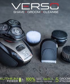 Remington Verso es la solución completa para las necesidades de afeitado, cuidado personal y limpieza de los hombres. Esta herramienta imprescindible cuenta con todo lo que necesitas para una rutina de aseo completa: Cepillo de limpieza; Cepillo de limpieza profunda, Cepillo de preparación pre-afeitado, Afeitadora y Recortadora. La afeitadora rotativa de triple cabeza es la atracción principal, diseñada para brindar cercanía y comodidad en tu afeitado diario. Su cuello HyperFlex se ajusta a cualquier ángulo de tu rostro y las cabezas rotativas PrecisionPlus capturan pelos cortos y largos con cada paso. Afeitado, cuidado personal y limpieza, todo con la misma base alimentada por litio; Verso simplifica tu rutina diaria con un rendimiento rápido y excepcional.