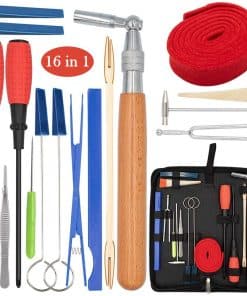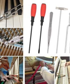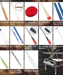 Kit de afinación de piano profesional: herramientas completas de afinación, te ayudan a afinar el piano a tiempo. Especificación: llave de ajuste en forma de L longitud: 11,8″ Palanca de amortiguador de plástico de doble extremo longitud: 7,87″ Zona de temperamento rojo: 40″x0,98 (Largo x Ancho) Mudo de cuña de goma: 3,9″x0,39″(Largo x Ancho) Mudo de goma con mango: 6″ de mango y 2″ de silenciador Pequeño martillo de metal: 6″x2,5″ (Largo x Ancho) Diapasón: 4,9″x0,75″ (Largo x Ancho) Cono de reparación, longitud 21 cm / 8,27″ Barra amortiguadora, longitud 19,5 cm / 7,68″ Destornillador ranurado: 6 mm x 10″ Destornillador Phillips: 4,5 mm x 10″ Tamaño del estuche de almacenamiento: 12,9″x5,5″x1,96″ (Largo x Ancho x Grosor) Paquete incluido: 1x llave fija de madera 1x barra de sonido de madera 1 x destornillador Phillips 1 x destornillador ranurado 1x cinta de parada 2 x horquilla de goma insonorizante 1 x pinzas de acero inoxidable 1 x martillo 1 x punzón 1x diapasón 440Hz 1x clip de parada de nylon 1 x tira de temperamento 2 x horquilla de goma parada 1x bolsa de herramientas