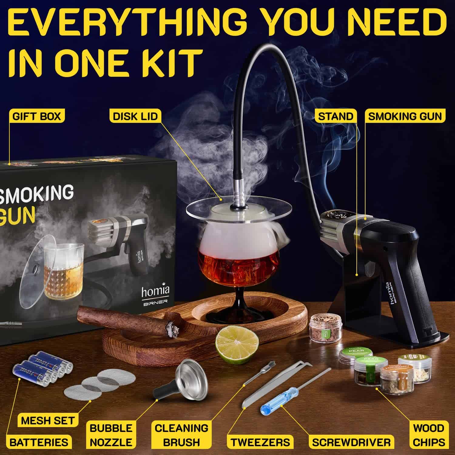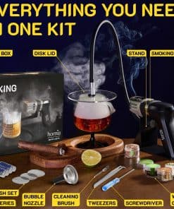 1. SET COMPLETO DE AHUMADOR DE CÓCTELES – Kit de inicio incluido 11 PCS – Recibirás una PISTOLA DE AHUMAR, soporte conveniente, manguera flexible, TAPA DE DISCO, 4 sabores de virutas de madera, Boquilla para Burbujas, 4 pilas AA, 3 mallas extras, pinzas para cepillo de limpieza, destornillador. ¡Listo para usar directamente de la caja! ¡Todo lo que necesitas para probar los mejores cócteles o whisky ahumados (La Mezcla de Burbujas no está incluida)!