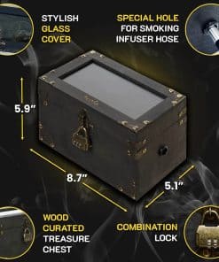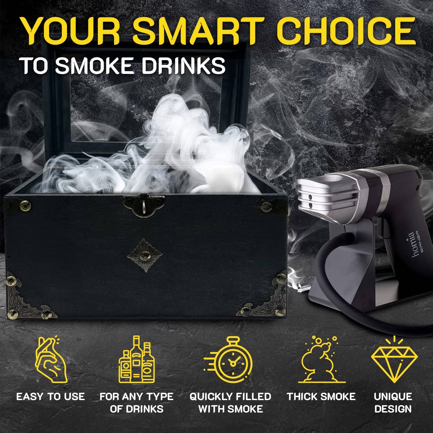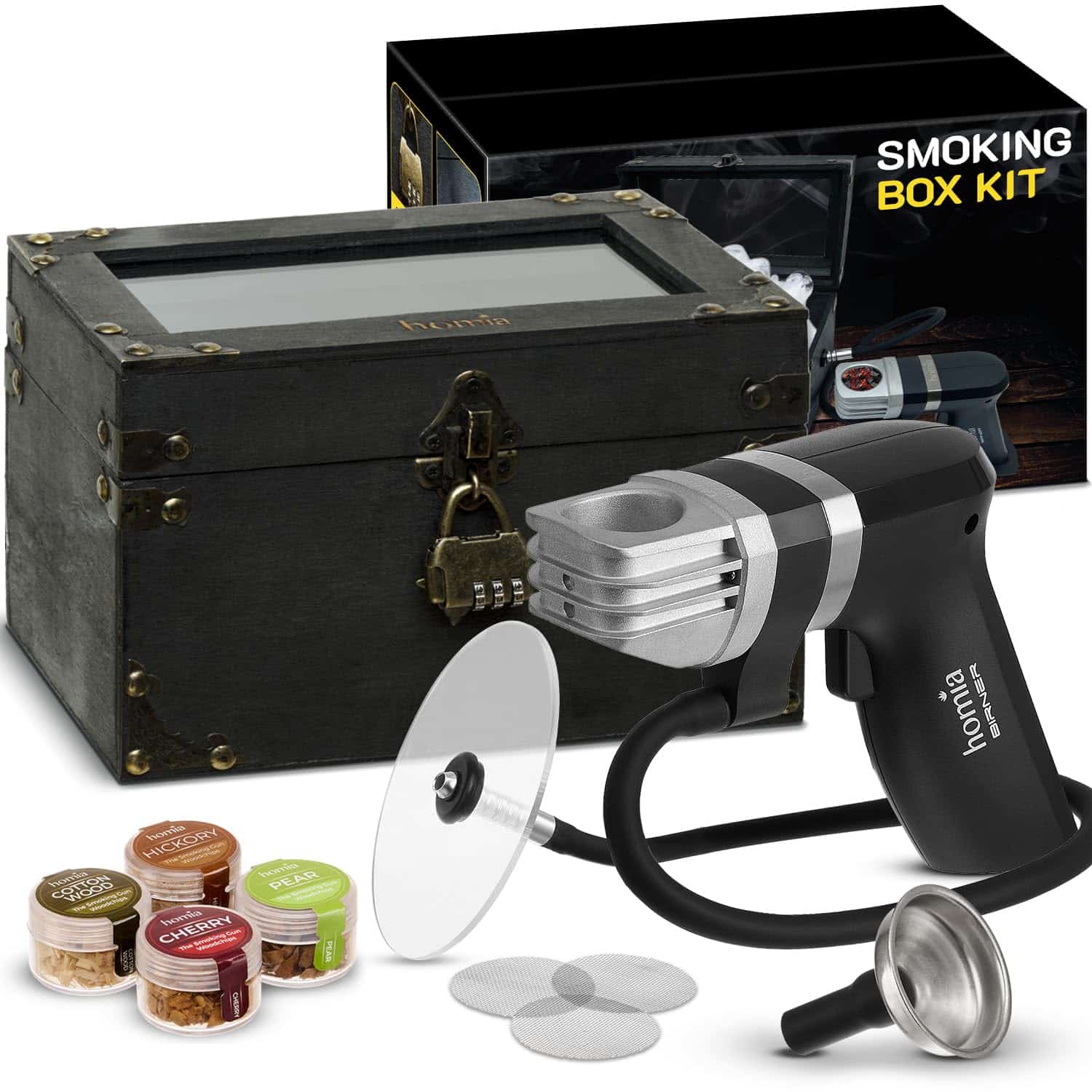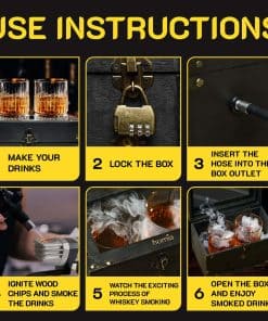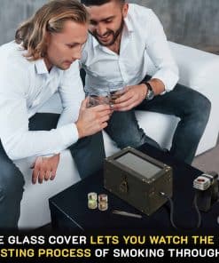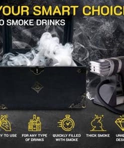 1. COCKTAIL SMOKER BOX SET INCLUIDO 12 PCS – Recibes Caja Ahumadora, Pistola de Ahumado, Soporte conveniente, Manguera flexible, TAPA de Disco, 4 sabores de VIRUTAS DE MADERA, Boquilla para Burbujas, 4 pilas AA, 3 malla extra, pinzas para cepillo de limpieza, destornillador. ¡Listo para usar desde el primer momento! (La Mezcla de Burbujas NO incluida). 2. AHUMADOR DE CÓCTELES PROFESIONAL con Cámara de Quemado de Metal y Ventilador de Metal puede limpiar y mantener fácilmente tu nuevo Infusor de Humo. Y con una Velocidad de Ventilador de hasta 2.3 m/s genera un humo frío intenso que se absorbe fácilmente en la comida y bebidas para ese sabor ahumado tierno. Diseño universal especialmente diseñado para infusores de humo. Puedes ahumar DOS cócteles al mismo tiempo. La caja del tesoro está hecha de madera natural en estilo antiguo. TAMAÑO DE LA CAJA: 8.7 x 5.1 x 5.9 pulgadas. 3. FÁCIL DE USAR Diseño Ergonómico que se adapta perfectamente en la mano y una cámara de quemado ancha ayuda a encender rápidamente las virutas de madera. El Ahumador de Whiskey producirá humo frío y aplicará un sabor delicioso a tu Whiskey o Cócteles, carne a la parrilla o sous vide, queso. CERRADURA DE OPERACIÓN – esta característica única te brinda a ti y a tus invitados mucha diversión. Haz tu cóctel favorito, ciérralo con llave y deja que tus invitados ganen su cóctel resolviendo el código. Se convertirá en tu Cóctel Ahumador favorito y el mejor regalo para hombres. 4. MULTIUSOS Y GRAN REGALO – Cóctel, Whiskey, Carne, Pescado, Queso – añade un sabor ahumado a prácticamente cualquier comida o cóctel. Este Ahumador de Cocteles lleva tus fines de semana a nuevas alturas y te hace sentir como un barman y chef profesional. También es un regalo útil para hombres para cualquier persona cercana en tu vida. Excelente elección de regalo para el Día del Padre y otras ocasiones: Cumpleaños, Día del Padre, Aniversario, Día de San Valentín, Acción de Gracias, Navidad, etc. 5. SOPORTE AL CLIENTE Y GARANTÍA con nuestra garantía extendida de 1 AÑO estás 100% protegido contra defectos o mal funcionamiento. Siempre estamos aquí cerca de ti para resolver cualquier problema surgido o responder cualquier pregunta que puedas tener. Nos alegra brindarte el más alto nivel de soporte posible. ¡Siéntete libre de contactarnos en cualquier momento, estaremos encantados de ayudarte!