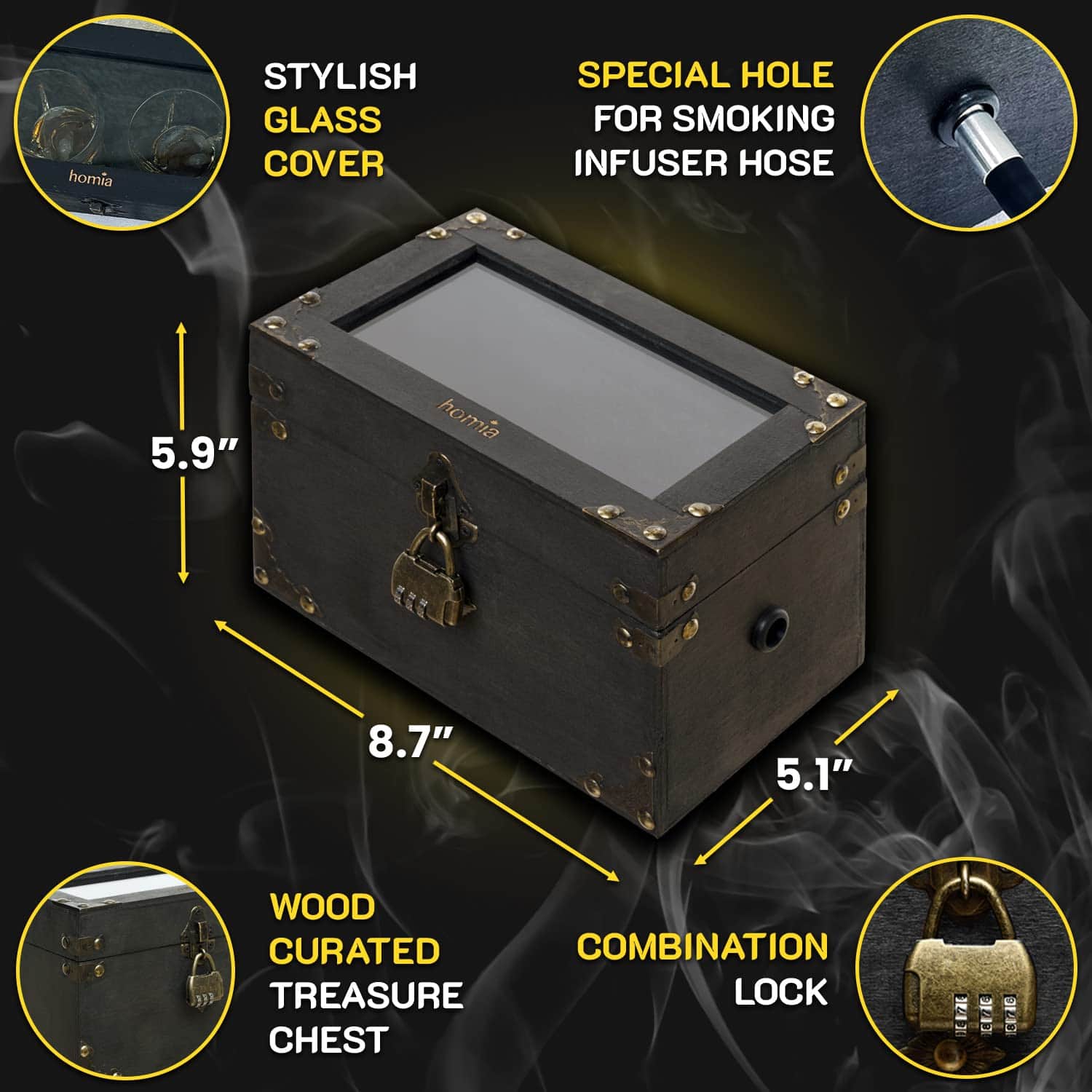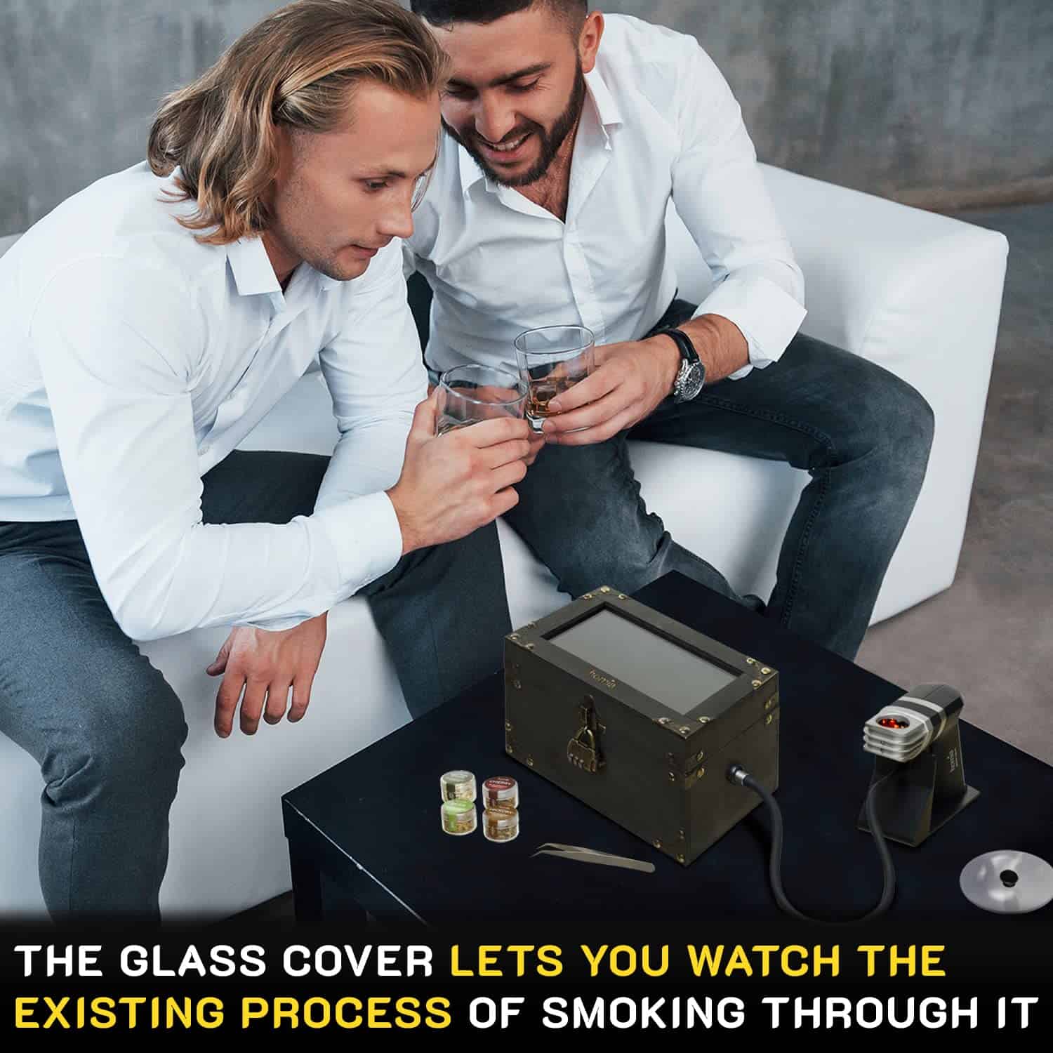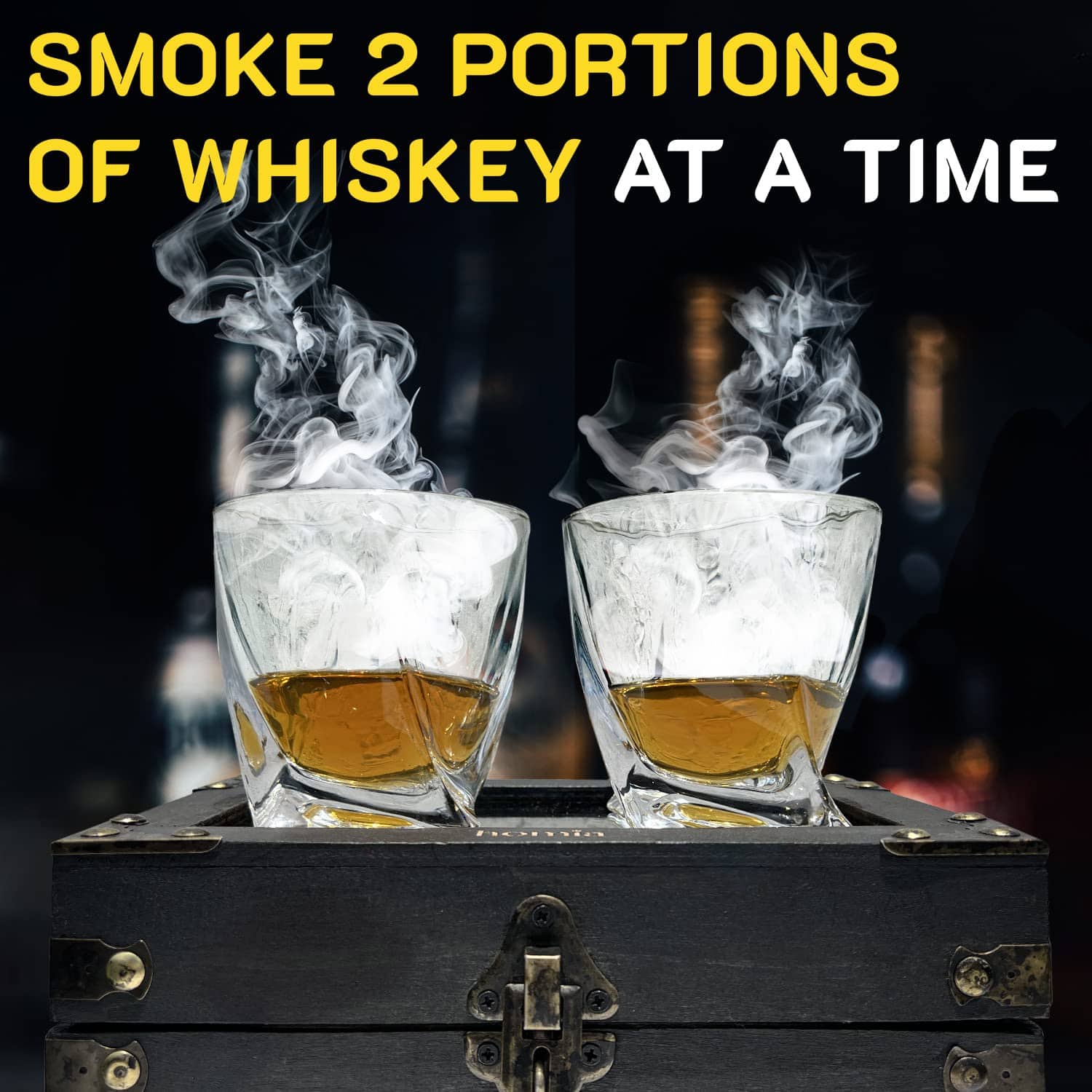 1. COCKTAIL SMOKER BOX SET INCLUIDO 12 PCS – Recibes Caja Ahumadora, Pistola de Ahumado, Soporte conveniente, Manguera flexible, TAPA de Disco, 4 sabores de VIRUTAS DE MADERA, Boquilla para Burbujas, 4 pilas AA, 3 malla extra, pinzas para cepillo de limpieza, destornillador. ¡Listo para usar desde el primer momento! (La Mezcla de Burbujas NO incluida). 2. AHUMADOR DE CÓCTELES PROFESIONAL con Cámara de Quemado de Metal y Ventilador de Metal puede limpiar y mantener fácilmente tu nuevo Infusor de Humo. Y con una Velocidad de Ventilador de hasta 2.3 m/s genera un humo frío intenso que se absorbe fácilmente en la comida y bebidas para ese sabor ahumado tierno. Diseño universal especialmente diseñado para infusores de humo. Puedes ahumar DOS cócteles al mismo tiempo. La caja del tesoro está hecha de madera natural en estilo antiguo. TAMAÑO DE LA CAJA: 8.7 x 5.1 x 5.9 pulgadas. 3. FÁCIL DE USAR Diseño Ergonómico que se adapta perfectamente en la mano y una cámara de quemado ancha ayuda a encender rápidamente las virutas de madera. El Ahumador de Whiskey producirá humo frío y aplicará un sabor delicioso a tu Whiskey o Cócteles, carne a la parrilla o sous vide, queso. CERRADURA DE OPERACIÓN – esta característica única te brinda a ti y a tus invitados mucha diversión. Haz tu cóctel favorito, ciérralo con llave y deja que tus invitados ganen su cóctel resolviendo el código. Se convertirá en tu Cóctel Ahumador favorito y el mejor regalo para hombres. 4. MULTIUSOS Y GRAN REGALO – Cóctel, Whiskey, Carne, Pescado, Queso – añade un sabor ahumado a prácticamente cualquier comida o cóctel. Este Ahumador de Cocteles lleva tus fines de semana a nuevas alturas y te hace sentir como un barman y chef profesional. También es un regalo útil para hombres para cualquier persona cercana en tu vida. Excelente elección de regalo para el Día del Padre y otras ocasiones: Cumpleaños, Día del Padre, Aniversario, Día de San Valentín, Acción de Gracias, Navidad, etc. 5. SOPORTE AL CLIENTE Y GARANTÍA con nuestra garantía extendida de 1 AÑO estás 100% protegido contra defectos o mal funcionamiento. Siempre estamos aquí cerca de ti para resolver cualquier problema surgido o responder cualquier pregunta que puedas tener. Nos alegra brindarte el más alto nivel de soporte posible. ¡Siéntete libre de contactarnos en cualquier momento, estaremos encantados de ayudarte!