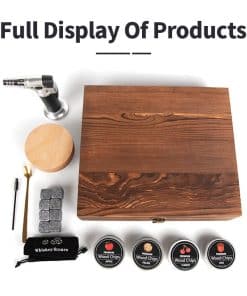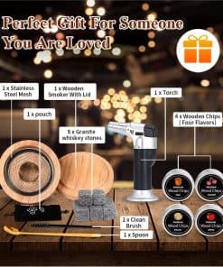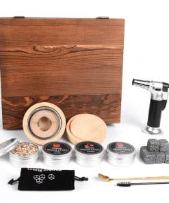Nuestro amor por el bourbon fue lo que nos guió a desarrollar un buen kit de ahumado que amamos y en el que confiamos, por lo que hemos incluido todas las necesidades para ayudarte a hacer el cóctel perfecto: Una antorcha de calidad premium (butano no incluido), seis (6) piedras de hielo de mármol para ayudar a mantener tu bebida fría (pero no aguada), cuatro (4) latas de astillas de madera (Pecan, Roble, Cereza, Manzana), el ahumador/infusor con pantalla y tapa, y una cuchara – Todos estos artículos enviados en una caja de madera artesanal cuidadosamente empaquetada, hecha de pino, para mantenerse organizado.
