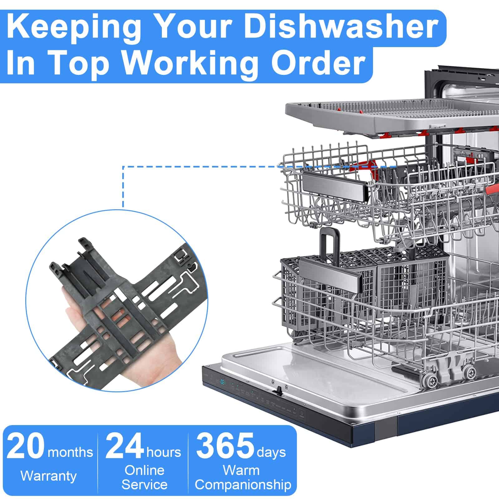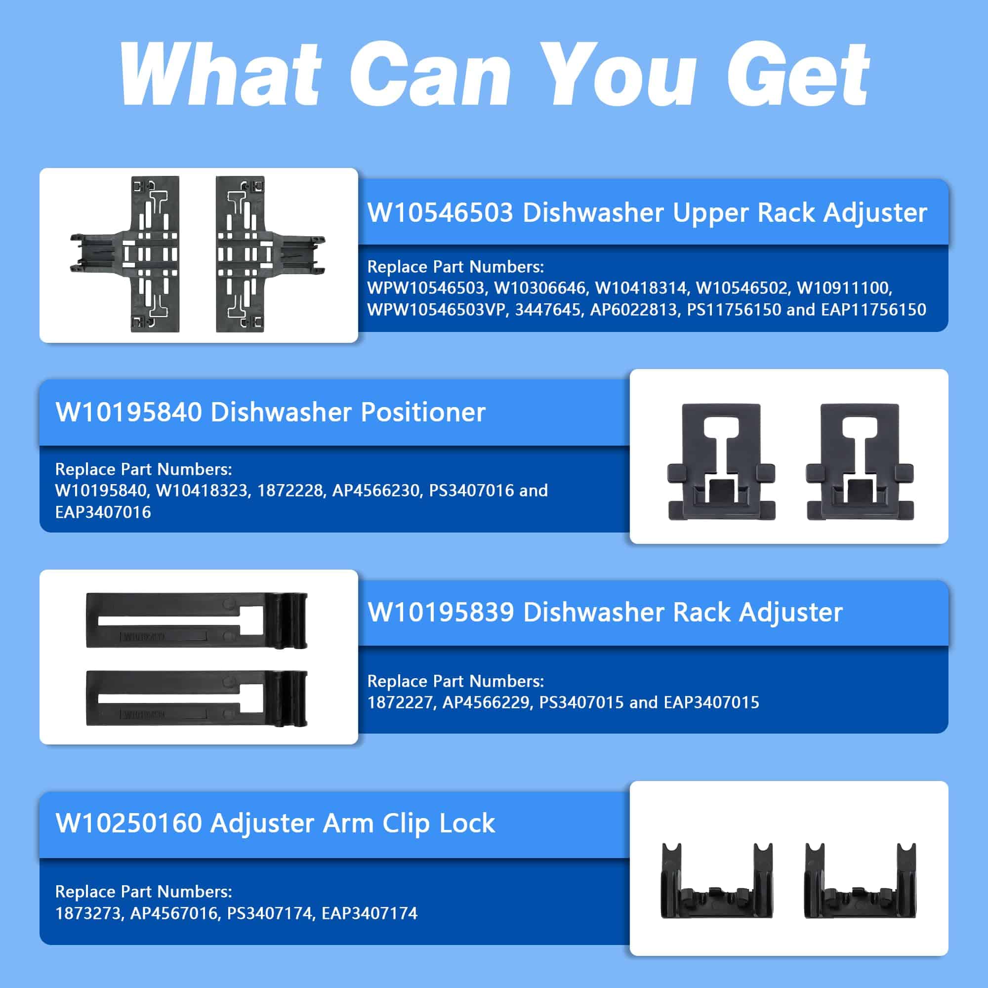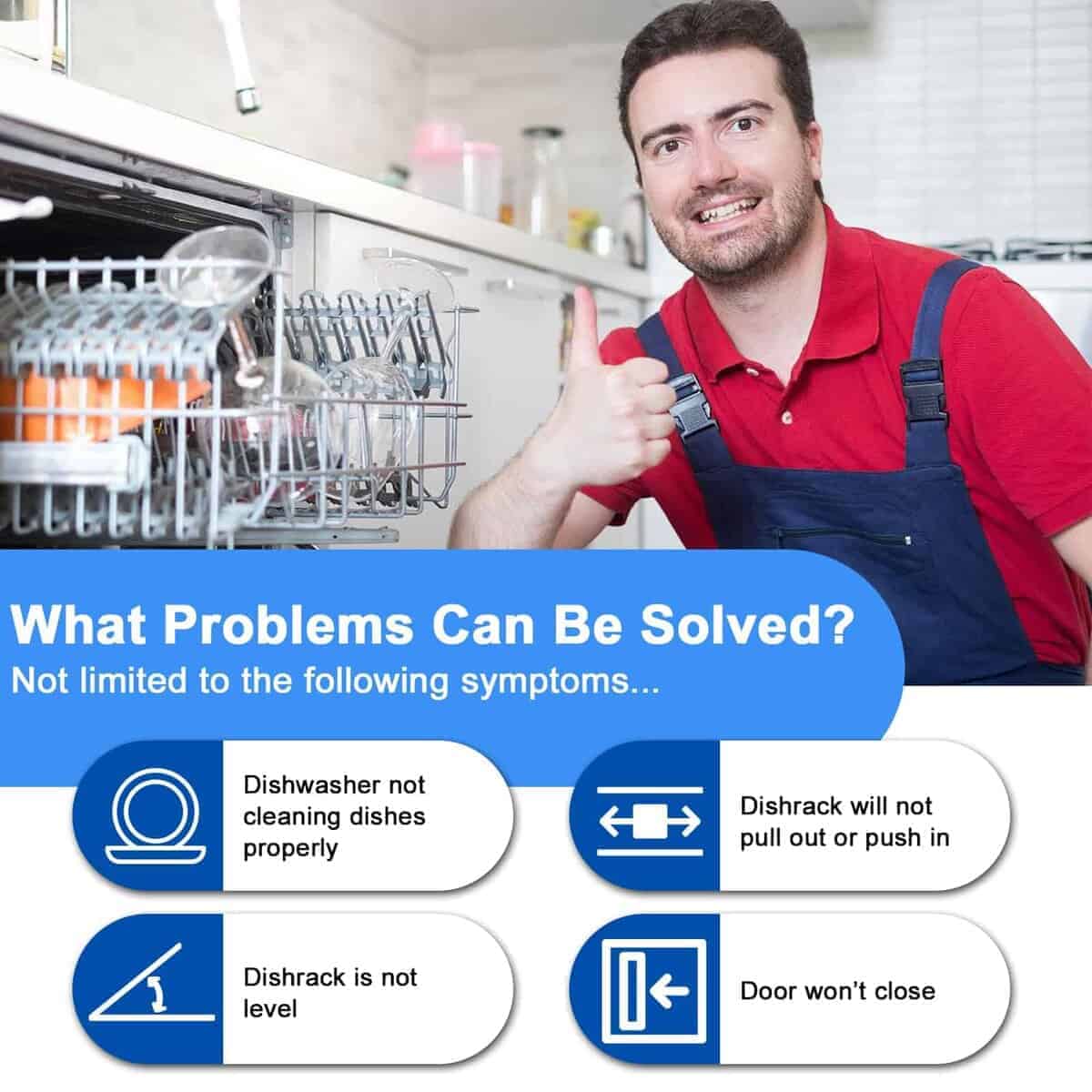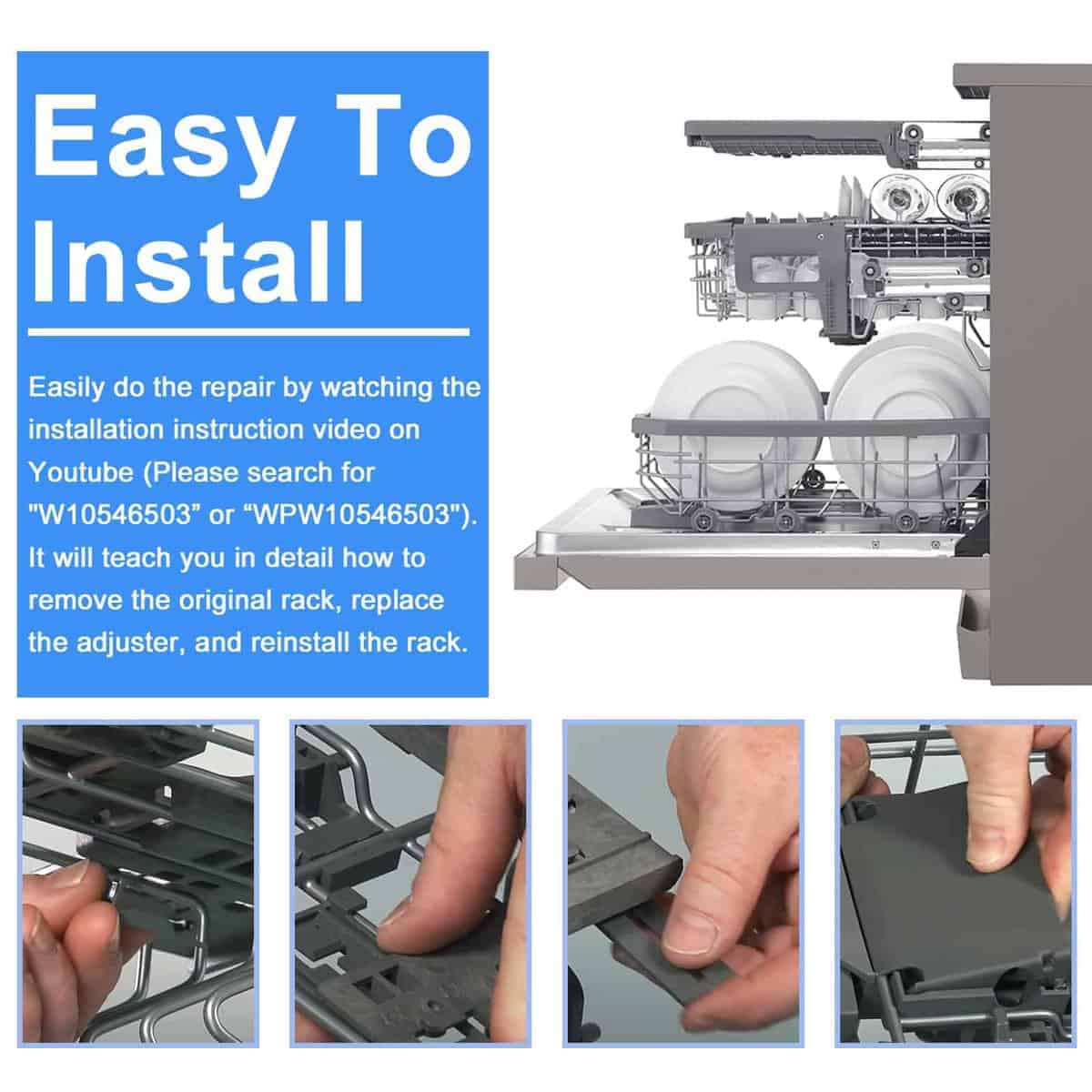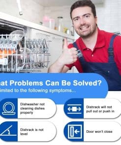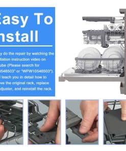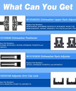 El actualizado W10546503 para ajustadores superiores de rejilla Kitcheneaid está hecho de materiales poliméricos avanzados que son más resistentes y persistentes que otros materiales. El kit completo ha sido probado exhaustivamente por el fabricante antes de salir de la fábrica para garantizar la seguridad y el uso prolongado, no son piezas OEM pero igualan la calidad de los requisitos OEM e incluso la superan. Sus preocupaciones sobre fragilidad, seguridad y durabilidad serán abordadas. El paquete incluye 2 x Ajustador de rejilla para lavavajillas W10546503, 2 x Posicionador de ajustador W10195840, 2 x Ajustadores de rejilla W10195839 y 2 x Clip de bloqueo de brazo de ajustador W10250160. Estas piezas de repuesto son capaces de solucionar eficazmente problemas como: el lavavajillas no lava correctamente; el estante no se desliza hacia adentro o hacia afuera; el estante no está nivelado, etc. El kit rentable de Funmit resolverá tus preocupaciones al lavar los platos y ayudará a prolongar la vida de tu lavavajillas. Funmit W10546503 & W10195839 & W10195840 & W10250160 kit de ajustadores de rejilla para lavavajillas encaja perfectamente en modelos de lavavajillas Whirlpool Kenmore Kitcheneaid, incluyendo 4KAER7685EW0, 4KMER7600AW0, 4KMER7685ES0, 4KMER7685EW0, 4KWFC120MAW0, 4KWFE7685ES0, 4KWFE7685EW0, ACR4303MEB0, ACR4303MES0, ACR4303MEW0, ACR4503SEB0, ACR4503SES0, ACR4530BAB0, ACR4530BAW0, AER5330BAB0, AER5330BAS0, AER5330BAW0, AER5630BAB0, AER5630BAS0, etc. Funmit se compromete a proporcionar a todos los clientes una experiencia de compra simple y sencilla de repuestos de rejilla superior para lavavajillas, y demostrar que tenemos las mejores partes y servicio. Apoyamos nuestros productos, y nuestros clientes son nuestro foco como empresa. Si tienes algún problema de calidad durante el periodo de garantía (¡20 MESES DE GARANTÍA GRATUITA!), por favor, ponte en contacto con el equipo de servicio al cliente de Funmit a tiempo, y nos aseguraremos de darte una solución satisfactoria. Puedes hacer fácilmente la reparación viendo el video de instrucciones de instalación en Youtube (Por favor, busca «W10546503 o WPW10546503»). Te enseñará detalladamente cómo quitar el estante original, reemplazar el ajustador y reinstalar el estante. Funmit te ayudará a ahorrar en costos de reparación elevados y te brindará un fuerte apoyo en tu camino de reparación DIY. Esperamos que esta reparación sea una experiencia gratificante e interesante para ti.