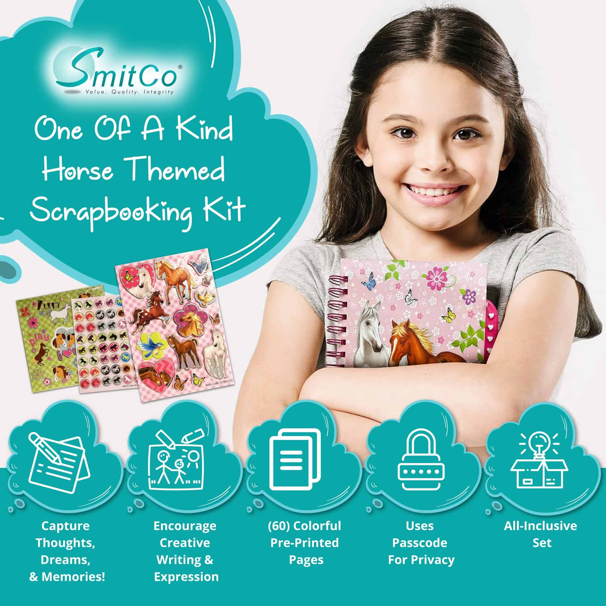 Quieres: Hacer que alguien se sienta especial con regalos para niñas de 5 a 10 años para un cumpleaños, Navidad, San Valentín, Pascua o cualquier ocasión especial Necesitas: Regalos para niñas de 5 a 12 años que le harán sonreír. A quién no le gusta recibir un regalo para CUALQUIER ocasión y la recompensa de la sonrisa es la mejor recompensa, ¿verdad? Deseas: Un regalo de calidad, pero asequible que ella atesorará durante muchos años porque guarda recuerdos y secretos que son valiosos para ella. Obtiene: Un kit de álbum de recortes para niñas con tapa dura y candado con contraseña. El candado con contraseña brinda privacidad de los ojos curiosos de los hermanos (¡y los padres!) Los artículos para niñas son geniales para una niña que ama a los caballos, ¡un tema muy popular, no solo en este momento, sino que es verdaderamente atemporal! El kit viene con un álbum de recortes perfumado de 60 páginas con páginas que tienen varios estampados decorativos, con 2 hojas de pegatinas perfumadas, gemas autoadhesivas, cinta adhesiva y un bolígrafo rosa con plumas, ¡para un total de 113 piezas para que pueda personalizar completamente su álbum de recortes mientras disfruta de horas de creatividad! ¡Nunca querrás quedarte sin populares pero lindos y asequibles conjuntos de regalos para niñas o niños de SMITCO! ¡No esperes más: AGREGA AL CARRITO HOY!