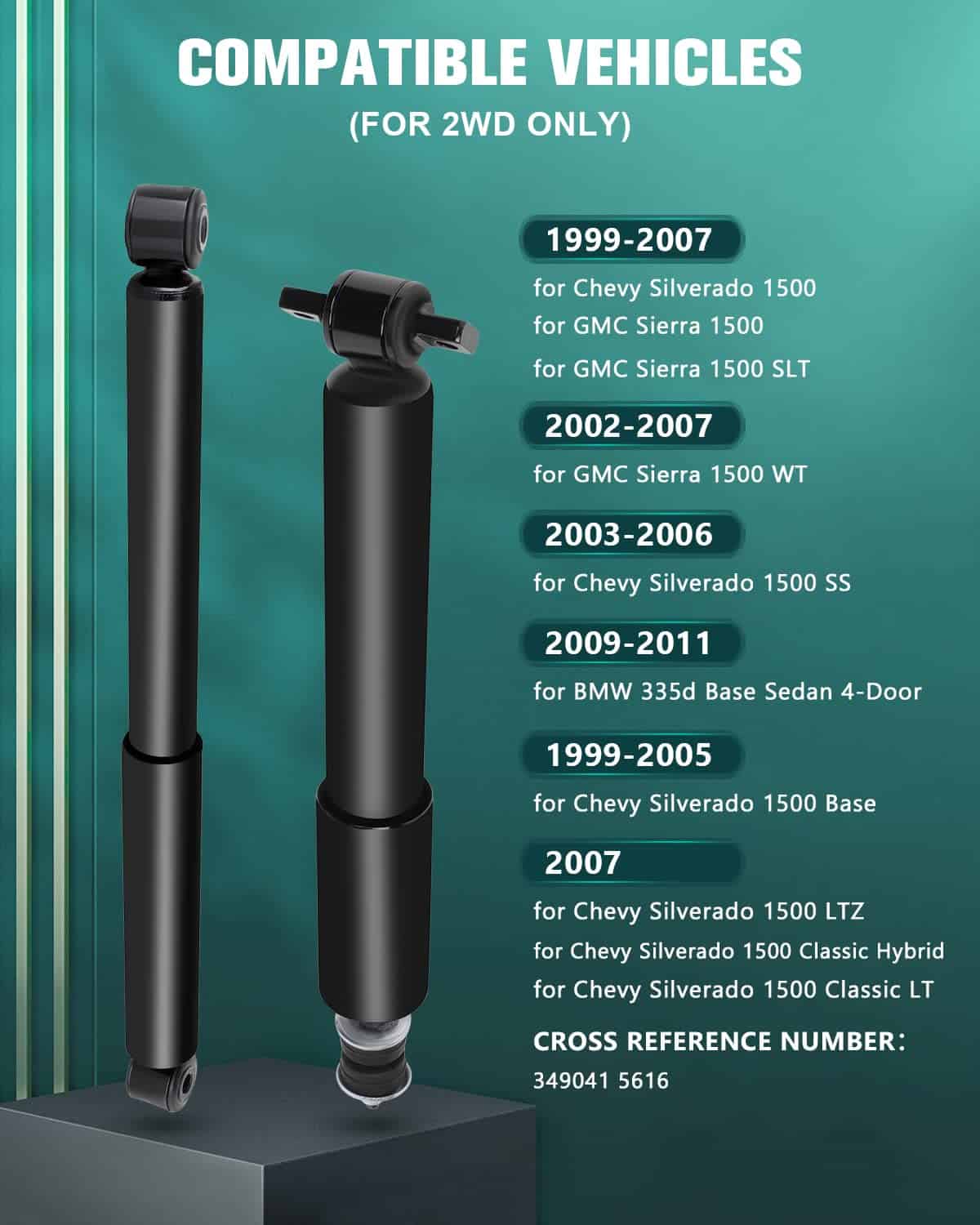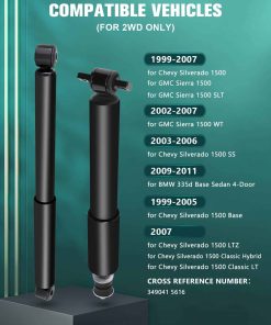 AUTOMUTO presenta un kit de amortiguadores de alto rendimiento diseñado para adaptarse a Silverado 1500 1999-2007 y Sierra 1500 1999-2007. Estos amortiguadores son compatibles con los números de parte 344380, 37149, 344365 y 37150 para los amortiguadores delanteros y traseros (NOTA: SOLO para 2WD-RWD). El vástago del pistón de alta resistencia ha sido sometido a un proceso especial para garantizar la fuerte resistencia al desgaste. Los sellos de aceite de calidad premium combinados con procesos de fabricación avanzados garantizan una mayor estabilidad y durabilidad. Estos amortiguadores son un reemplazo directo de los originales del vehículo sin necesidad de modificaciones. La superficie tratada con un fino rectificado evita la corrosión causada por la lluvia ácida. El diseño optimizado de los amortiguadores evita las fugas de aceite bajo carga dinámica y reduce la fricción inválida. Con un buen efecto de amortiguación, estos amortiguadores absorberán eficazmente el impacto de la conducción del vehículo, mejorando la comodidad en la conducción y la vida útil de los componentes del sistema relacionados. El paquete incluye un par de amortiguadores delanteros y un par de amortiguadores traseros, todos productos nuevos probados para cumplir o superar las especificaciones OEM.